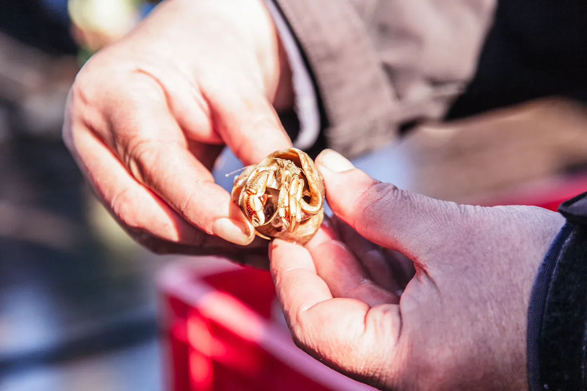 Er packt eine große Kiste in unsere Mitte auf einen Tisch. Darin tummeln sich Krabben, Taschenkrebse und Muscheln, über die wir Wissenswertes erfahren. Ein freudiger Aufschrei aus der Meute verrät mir plötzlich, dass wir unser Ziel erreicht haben.