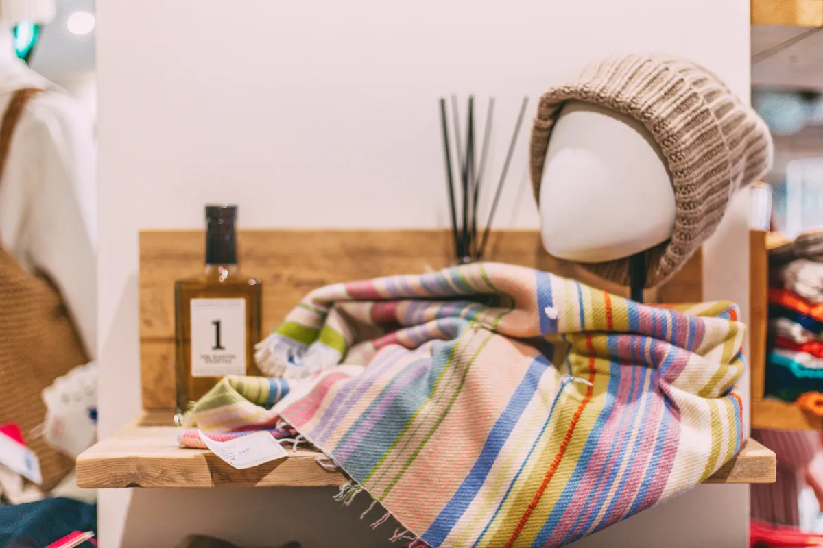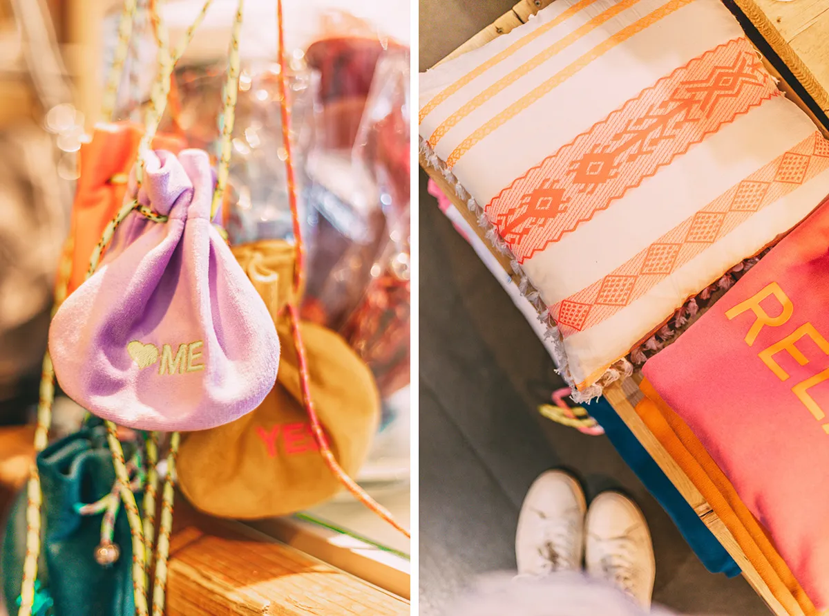 Bei AFJ findest du Fashion und Accessoires aus Italien, Frankreich, Amerika und Deutschland. Britt und Axel kennen die Geschichten hinter den Premiumlabels, die sie in ihr Sortiment aufnehmen. Sie erzählen mir zum Beispiel von den Tüchern, Schals und Plaids der Marke The Holy Goat. Jedes einzelne von ihnen in Nepal in Handarbeit gesponnen, gewebt bestickt. Die schönen bunten Plaids passen einfach immer und sind in 20 Farbvarianten zu haben.