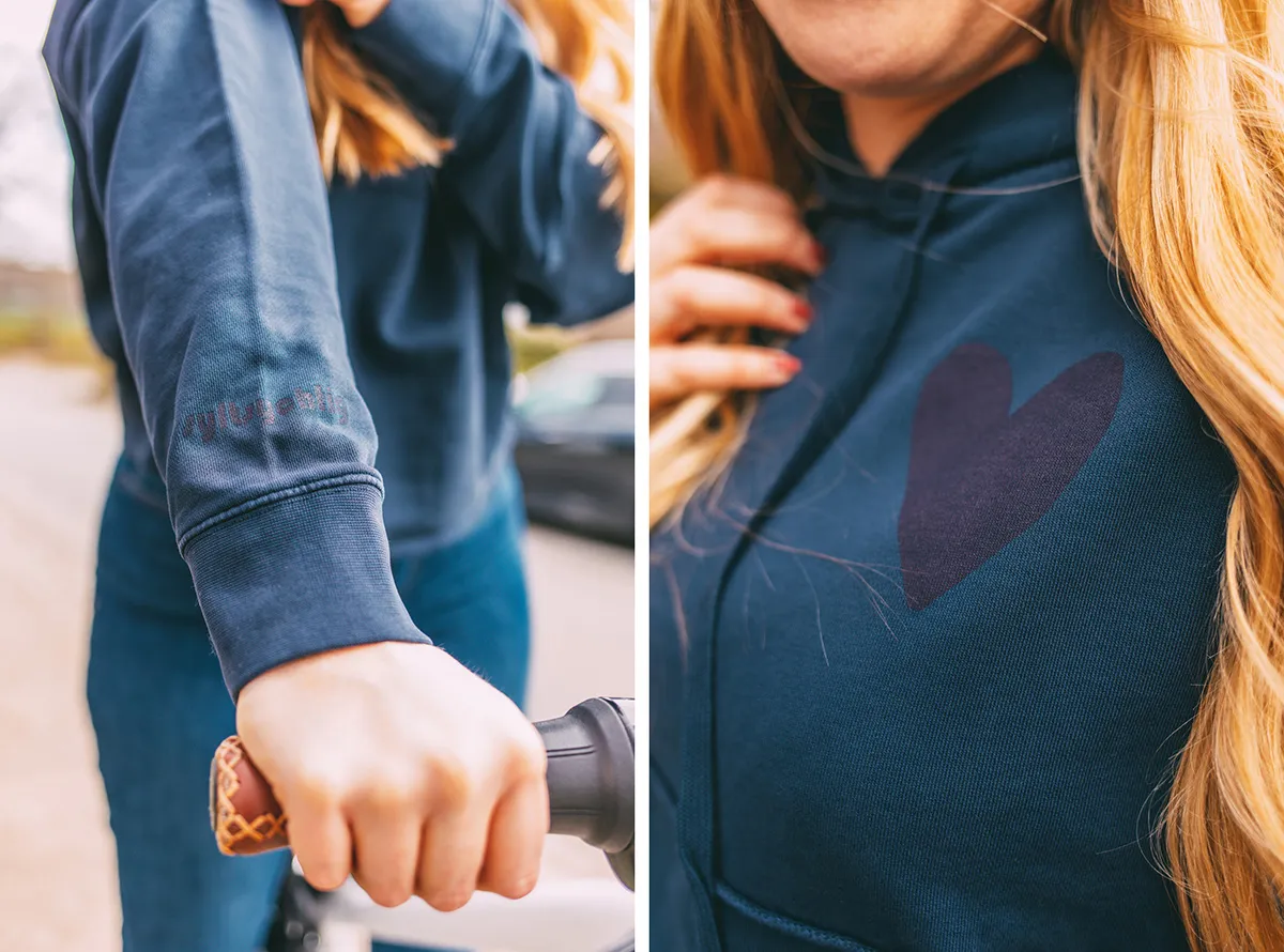 Neben Dunkelblau ist der Hoodie auch in Sand und Hellbeige erhältlich. Die Größen reichen von S bis XL.