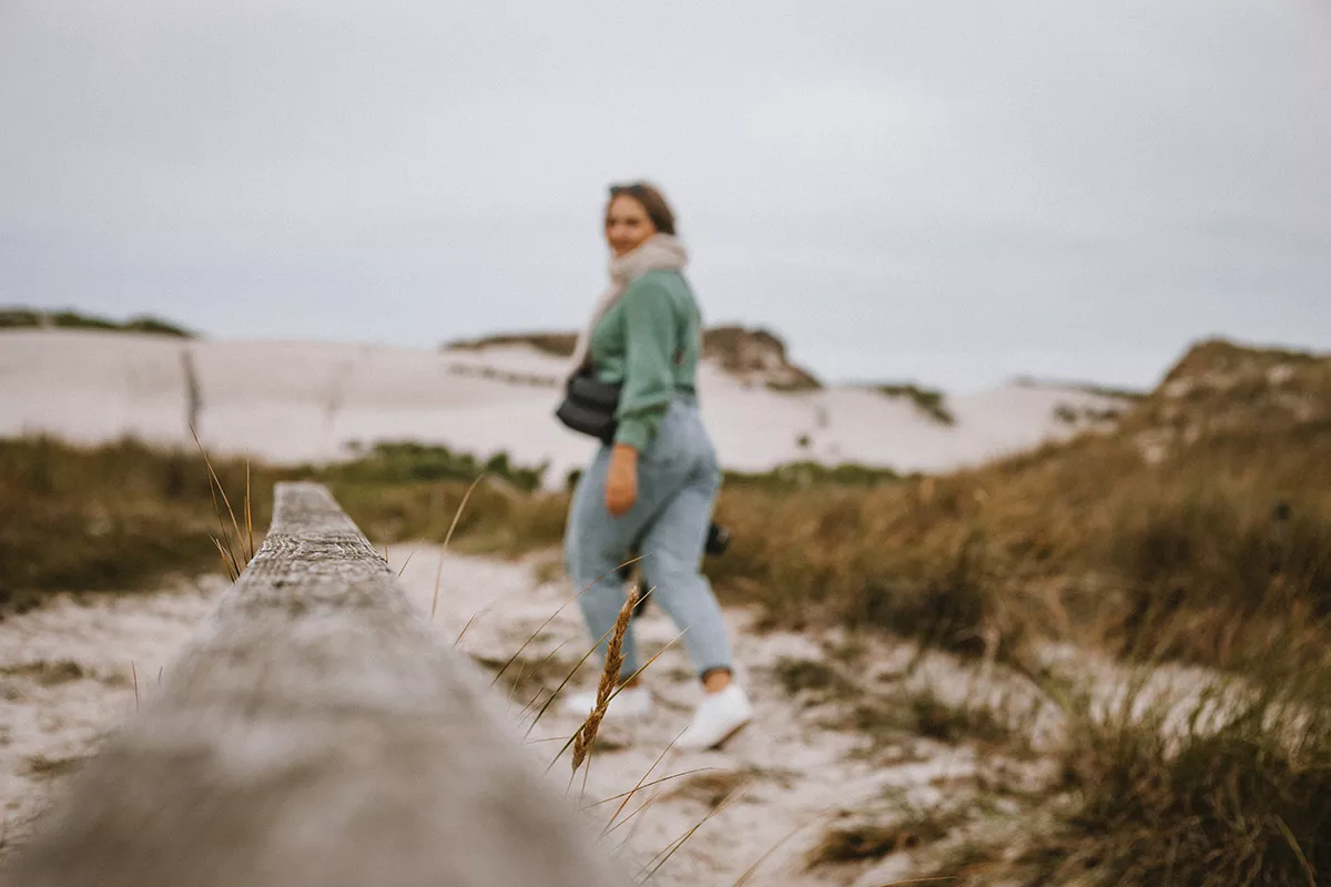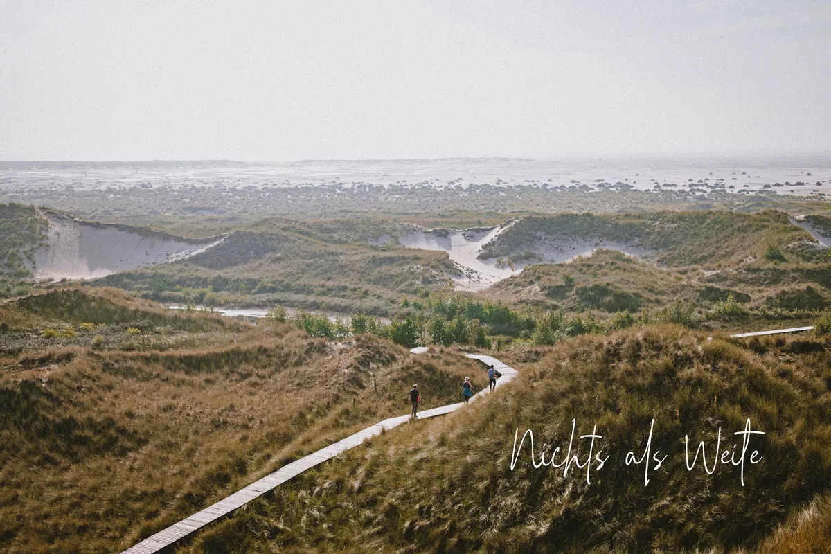 Die Promenade geht in die sogenannten Bohlenwege übergeht, welche in die beeindruckende Dünenlandschaft hineinführen. Für mich haben die geschwungenen Holzwege etwas Mystisches und könnten einem Bilderbuch entsprungen sein. Nahe dem FKK-Zeltplatz erklimme ich eine Aussichtsdüne, die einen spektakulären Panoramablick bis zum Leuchtturm ermöglicht.