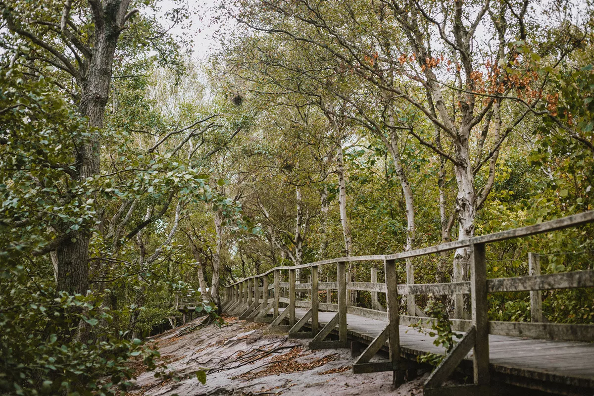 Auf dieser Strecke befindet sich ein kleiner Yacht- und Seezeichenhafen mit niedlichen Kuttern. Der Weg durch den verwunschenen Wald ist allerdings nicht weniger schön, denn hier liegen eine unglaubliche Ruhe und der Duft nach Tannengrün in der Luft. Insbesondere die dort verankerte Vogelkoje mit ihrem roten „Hexenhäuschen” ist ein herrlicher Ort für Naturliebhaber:innen. Alles in allem regiert die Natur auf Amrum und ich könnte mich darin jetzt schon verlieren.