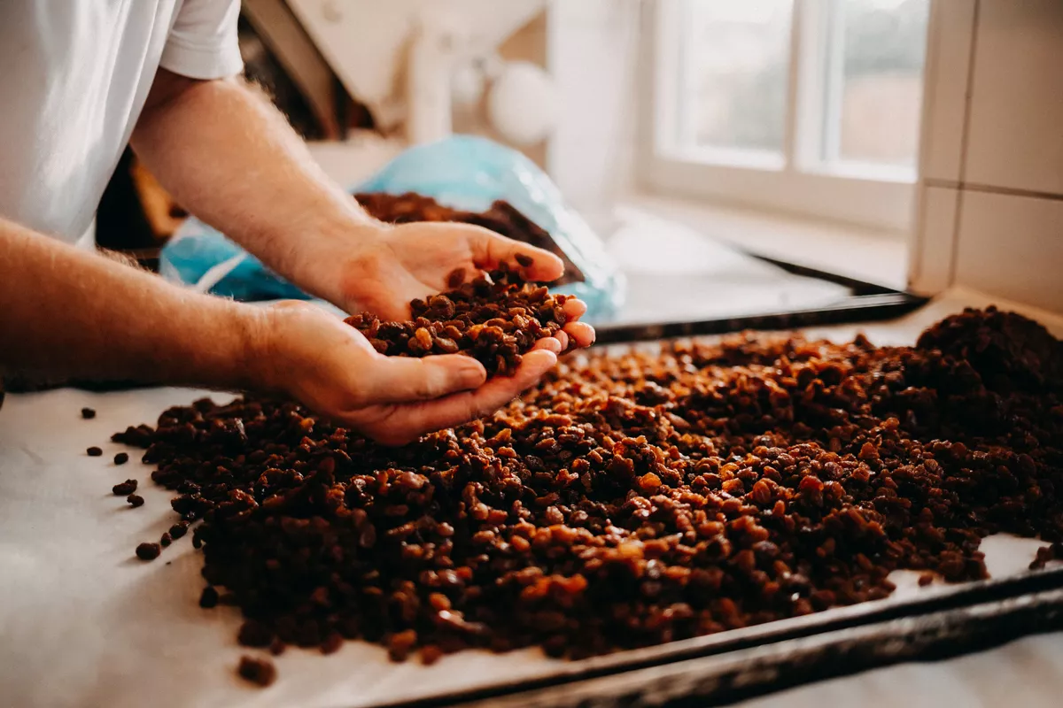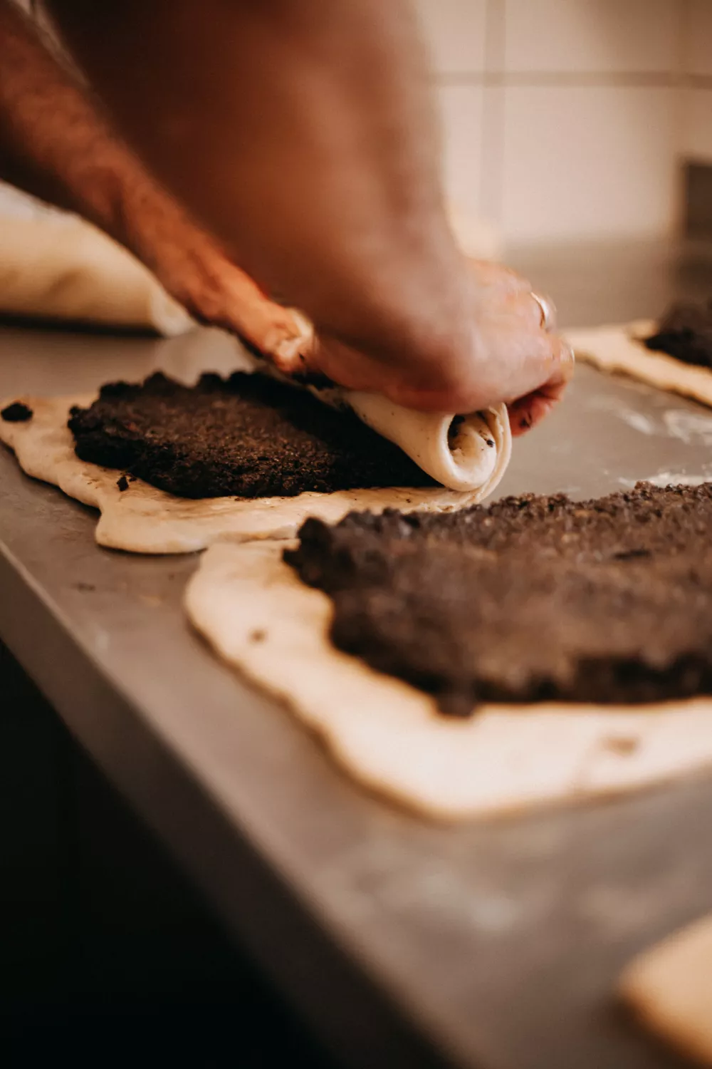 Besonders zur Weihnachtszeit verwandelt sich Abeling in ein wahres Paradies für Naschkatzen wie mich. „Das sind alles Wickelstollen“, erklärt mir Klaus Funke stolz, während er an einem Mohnstollen arbeitet. In liebevoller Handarbeit wird der Teig ausgerollt, gefüllt und dann gewickelt – ein aufwendiger Prozess, der Zeit und Geschick erfordert. „Die Mandelmarzipan-, Mohn- und Nussstollen brauchen jede Menge Vorarbeit. Die Nüsse müssen gekocht, gewürzt und gut durchgezogen werden. Bis alles bereit ist, dauert es oft Tage.“
