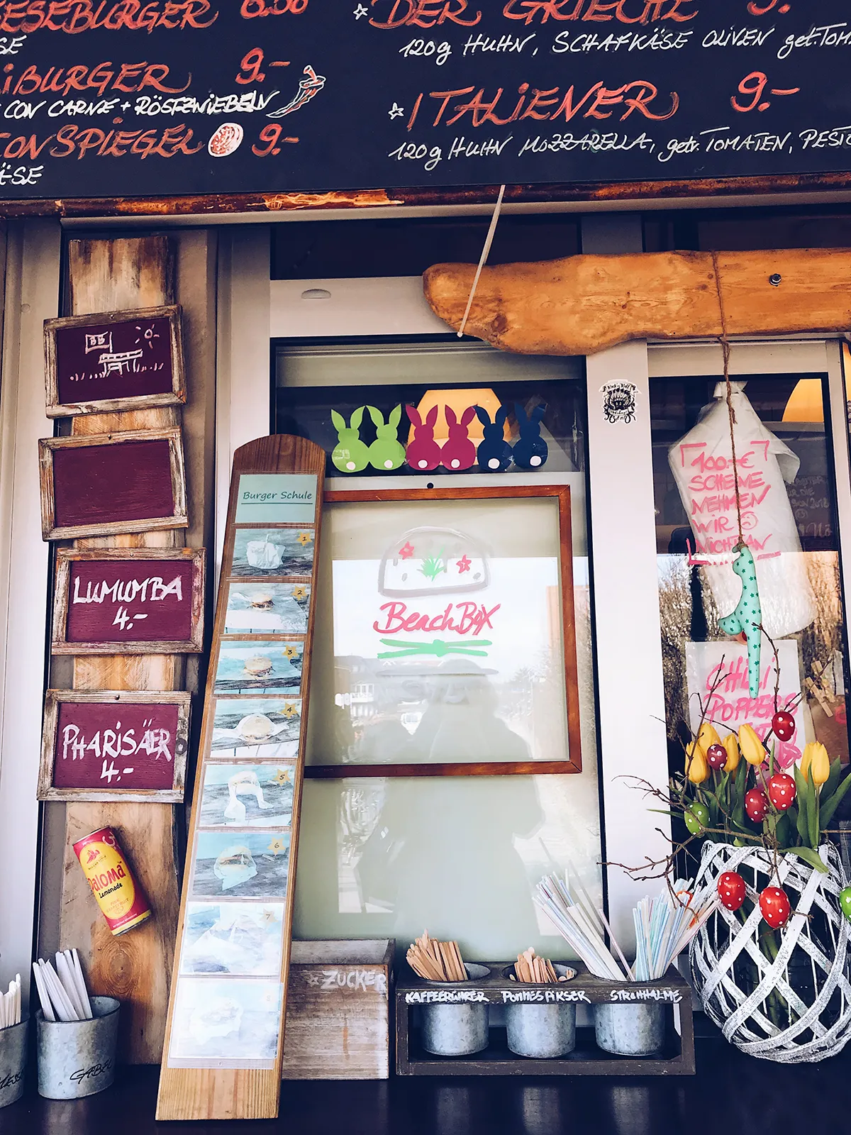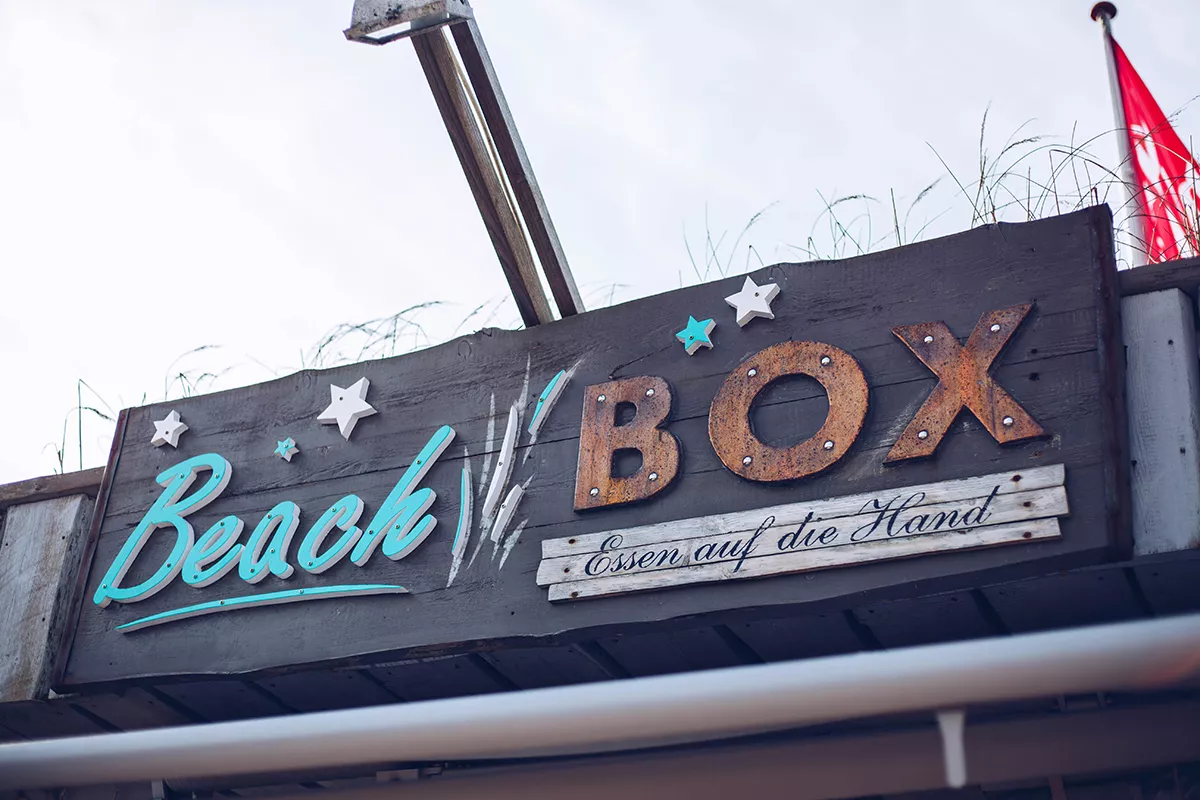 Ein großes Schild mit der Aufschrift „Beach Box“ prangt über dem Holzverschlag. Drinnen brutzeln die Inhaber, Carina und Lars, was das Zeug hält. Was sofort auffällt: Diese Bude ist nicht irgendein Imbiss. Mit Laternen, Blümchen und vielen bunten Details ist sie mit so viel Liebe gestaltet, dass man sich direkt wohlfühlt. Mein Highlight: die „Burger-Schule“, die charmant erklärt, wie man Hamburger & Co. am besten mampft.