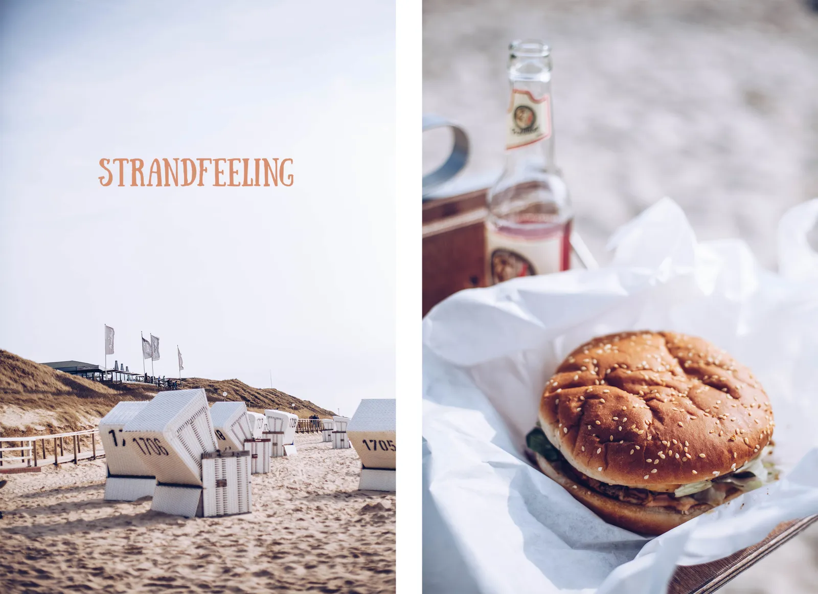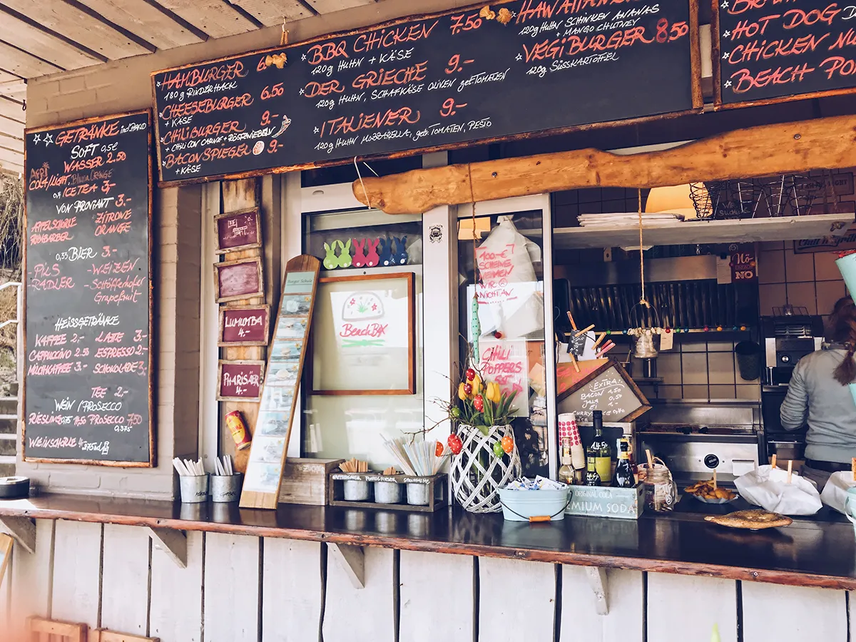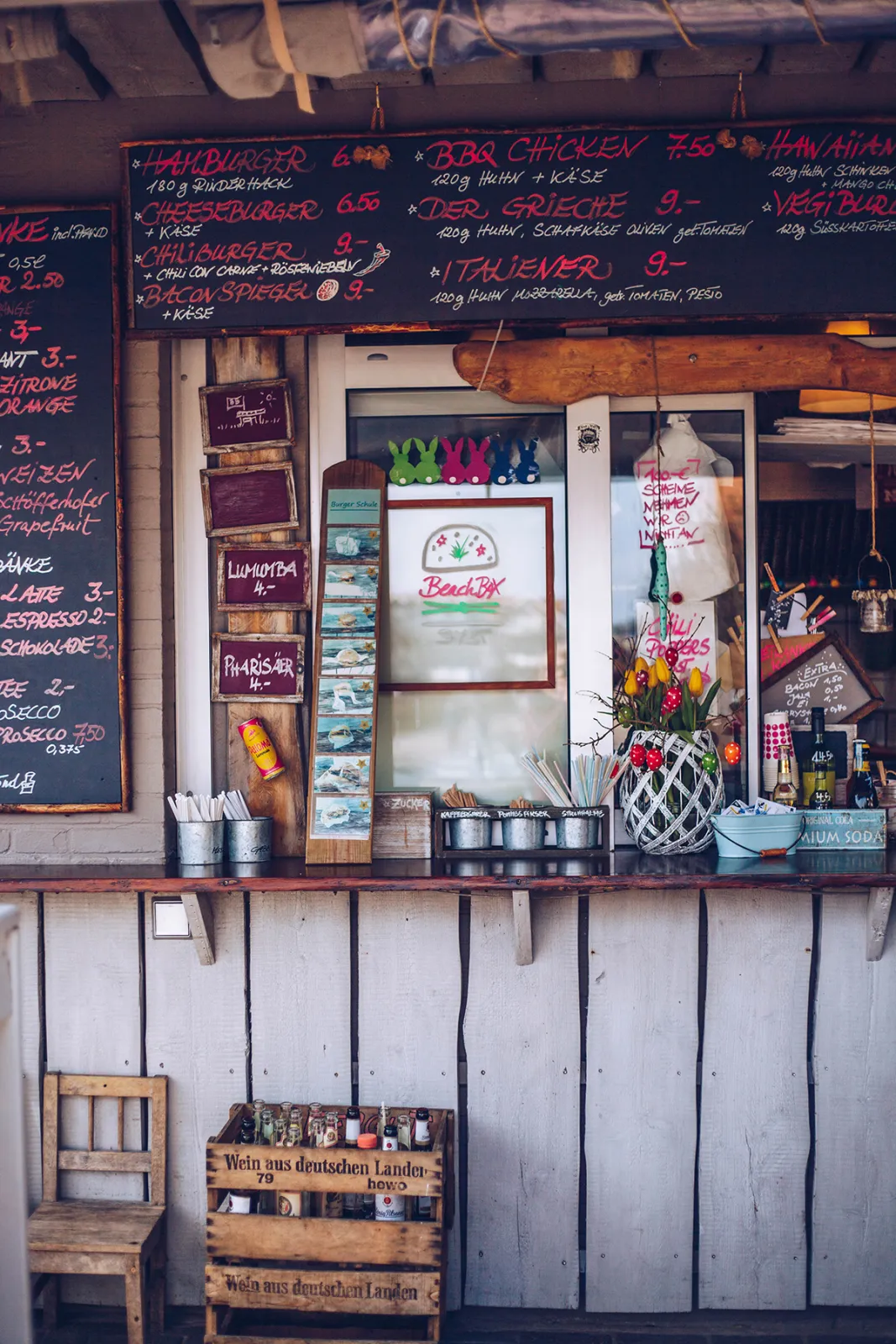 Auf den handbeschriebenen Tafeln studiere ich die riesige Auswahl: Burger, Hot Dogs, Wraps und jede Menge Snacks. Alles zum Mitnehmen. Auch wenn es ein paar Stehtische gibt, war meine Mission klar: Ich wollte meinen Burger im Strandkorb mit Meerblick genießen!