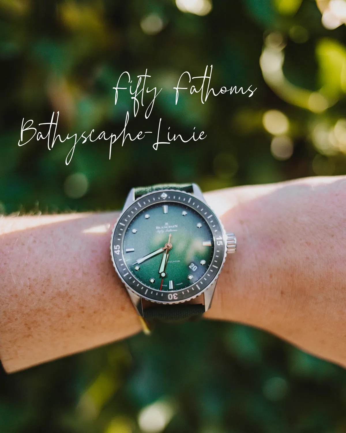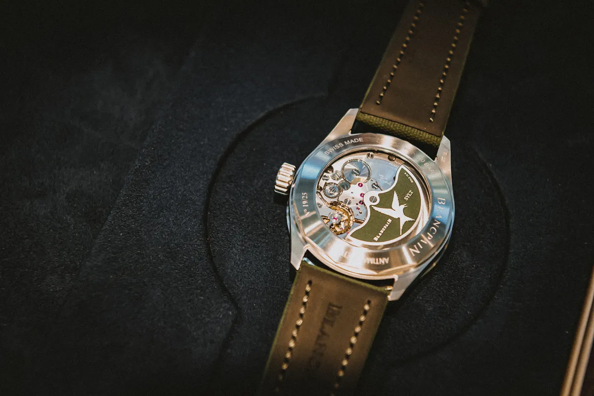 Ich gebe zu, dass ich von Uhren nicht viel verstehe, aber dennoch beeindruckt mich das elegante Modell in Grün mit seinem Gehäuse aus Titan. Insbesondere das vertikal geschliffene Zifferblatt fängt das Licht auf faszinierende Weise ein. Ein Blick auf die Rückseite offenbart nicht nur die Schönheit des verzierten Uhrwerks, sondern auch die Silhouette der Küstenseeschwalbe, die auf den Rotor aus massivem Gold graviert ist – ein Symbol für den Blancpain-Naturschutz auf Sylt.