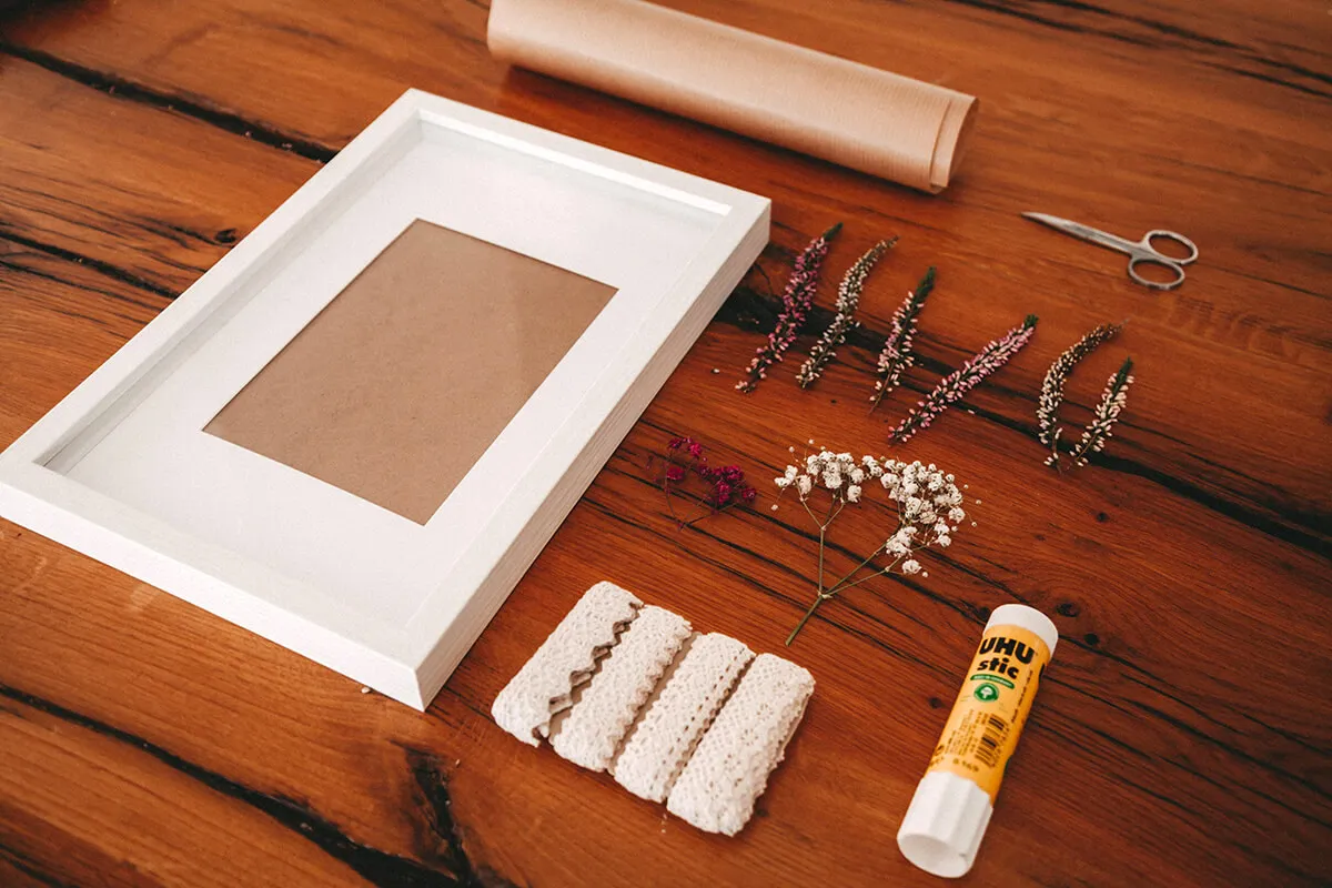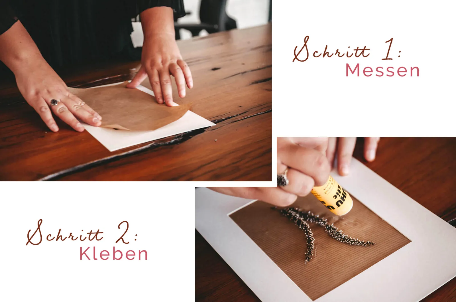 Platziere das Passepartout wieder vorsichtig in den Bilderrahmen, sodass die Heide kleben bleibt. Verschließe dann den Rahmen sorgfältig.