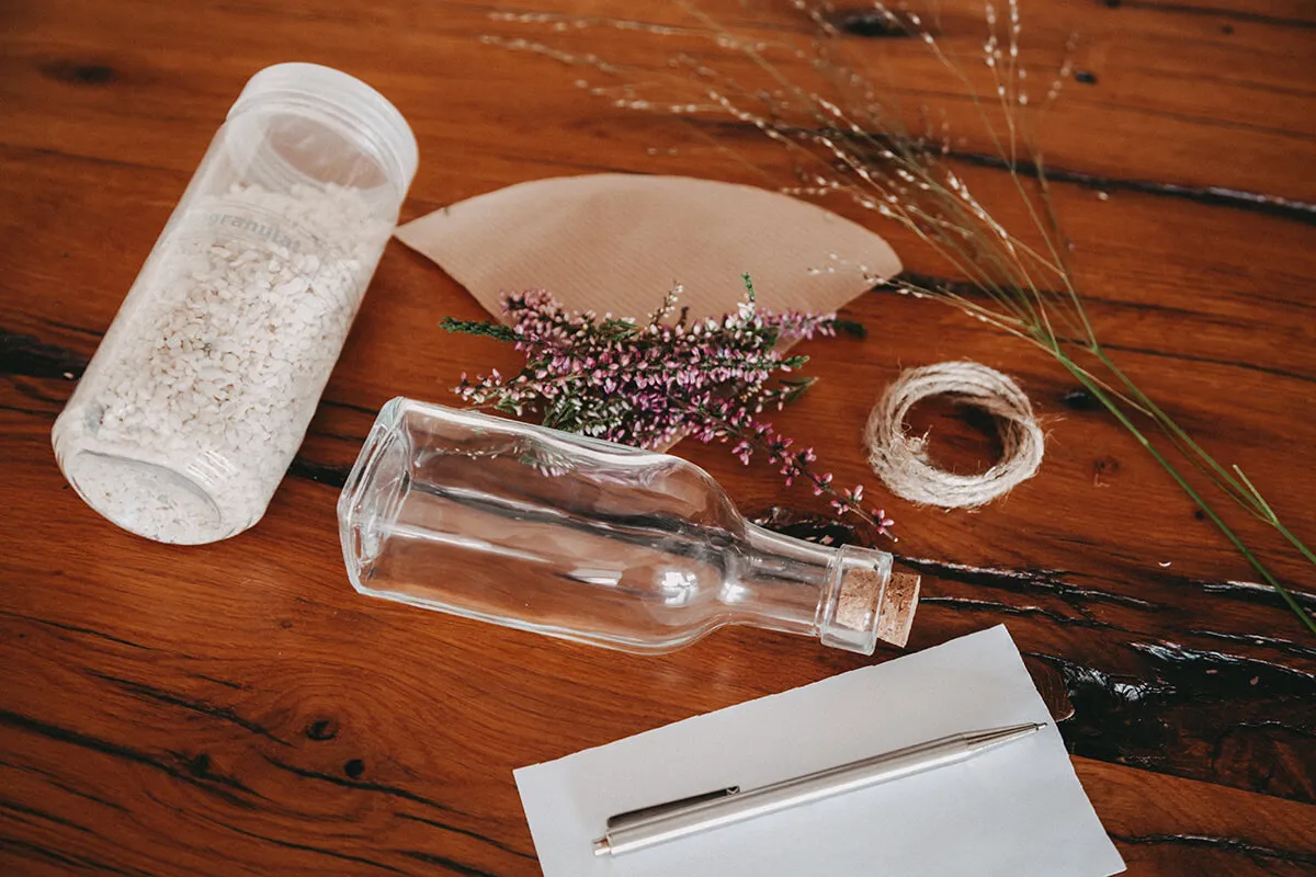 Schreibe auf einen kleinen Zettel eine schöne Nachricht oder nehme einen Gutschein. Rolle das Papier anschließend auf und binde es mit einem kleinen Stück Kordel zu. Dann ab damit in die Flasche.