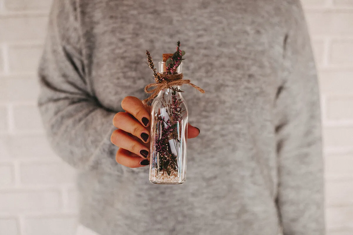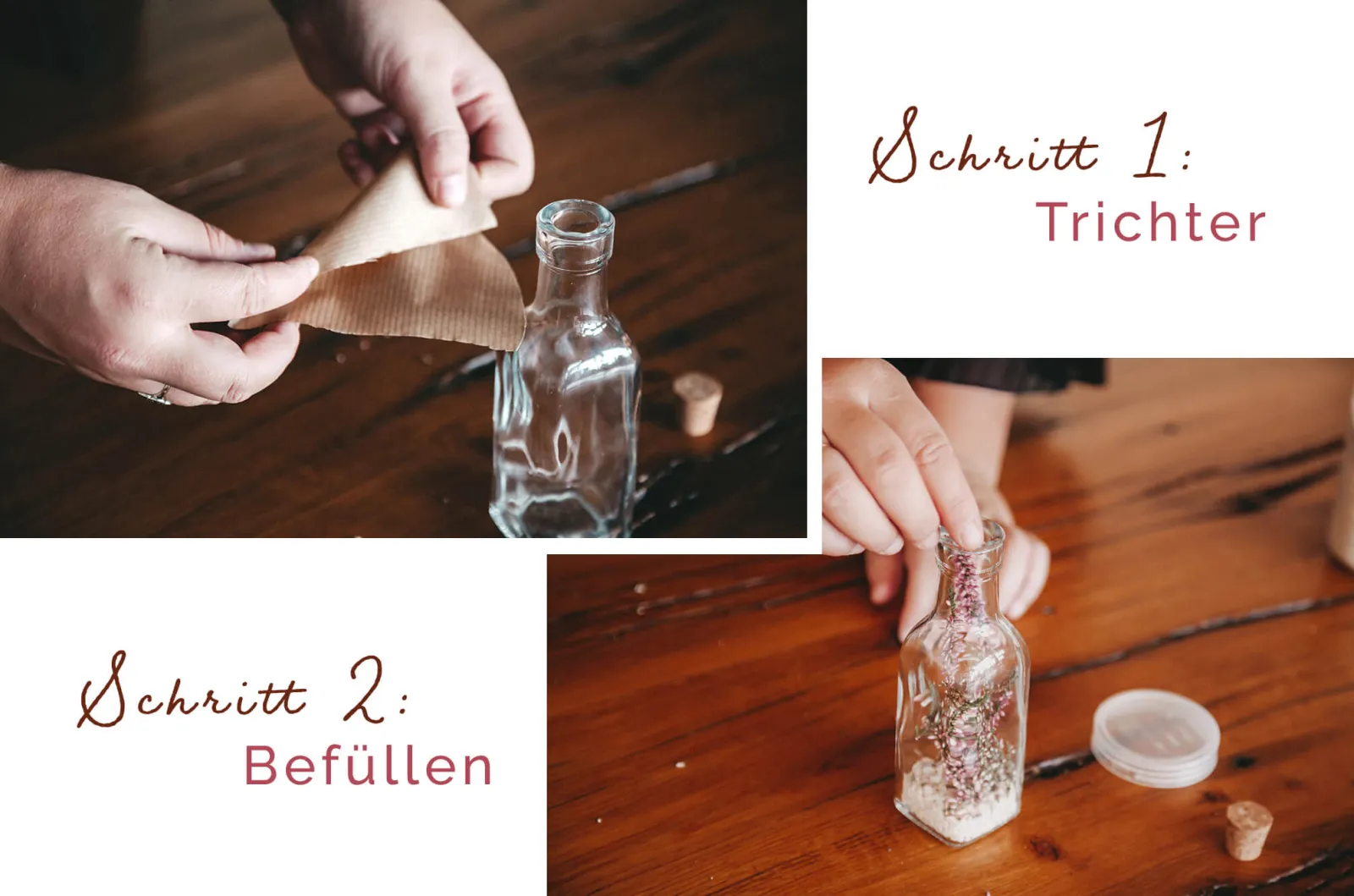 Befülle die Flasche ganz nach deinem Belieben: Dekogranulat, Blumen, Gräser und nicht zu vergessen – die Heide.