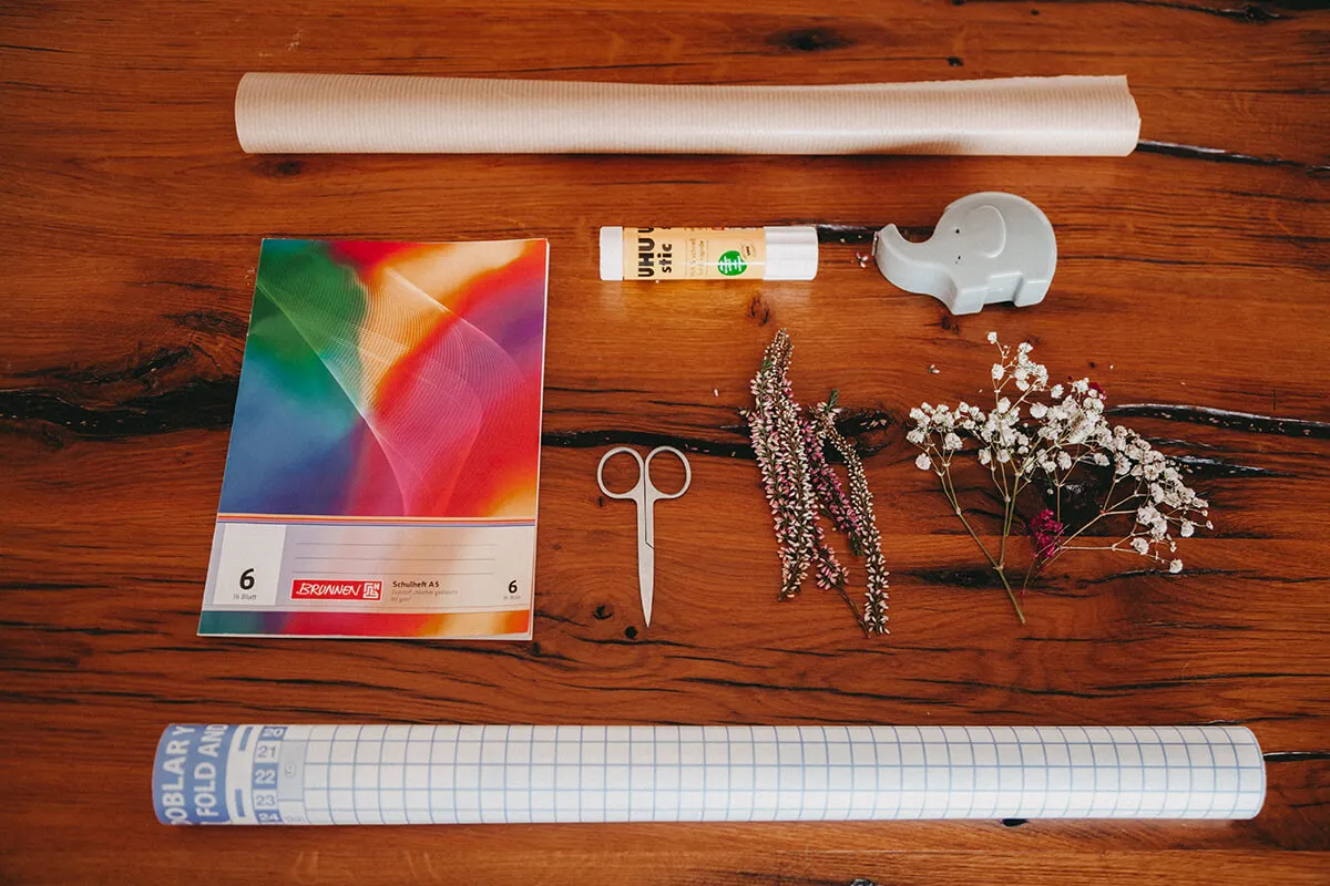 Schlage das Heft vorsichtig in durchsichtige Klebefolie ein. Lasse dir dabei gerne helfen, damit keine unschönen Blasen oder Falten entstehen.