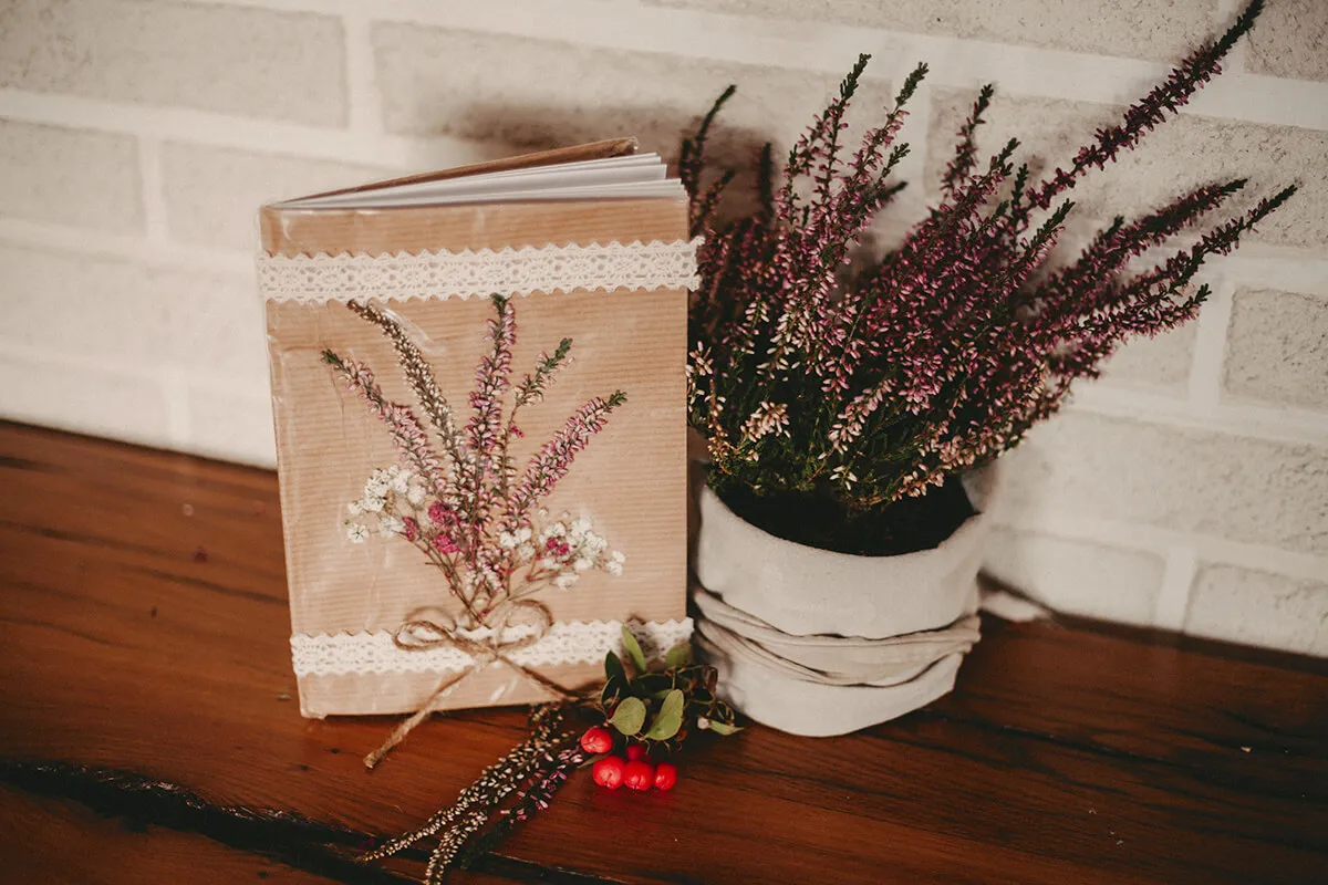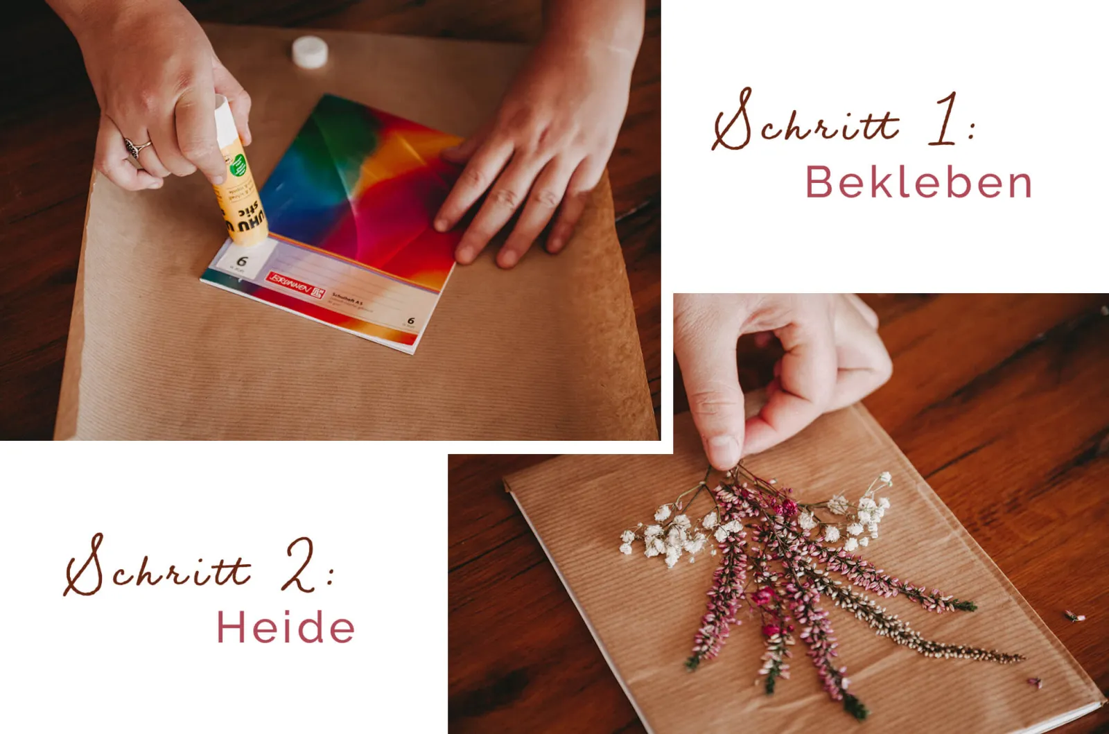 Dekoriere die Vorderseite des Hefts mit deiner Heide, lege sie in eine schöne Form und klebe sie mit dem Klebestift fest.