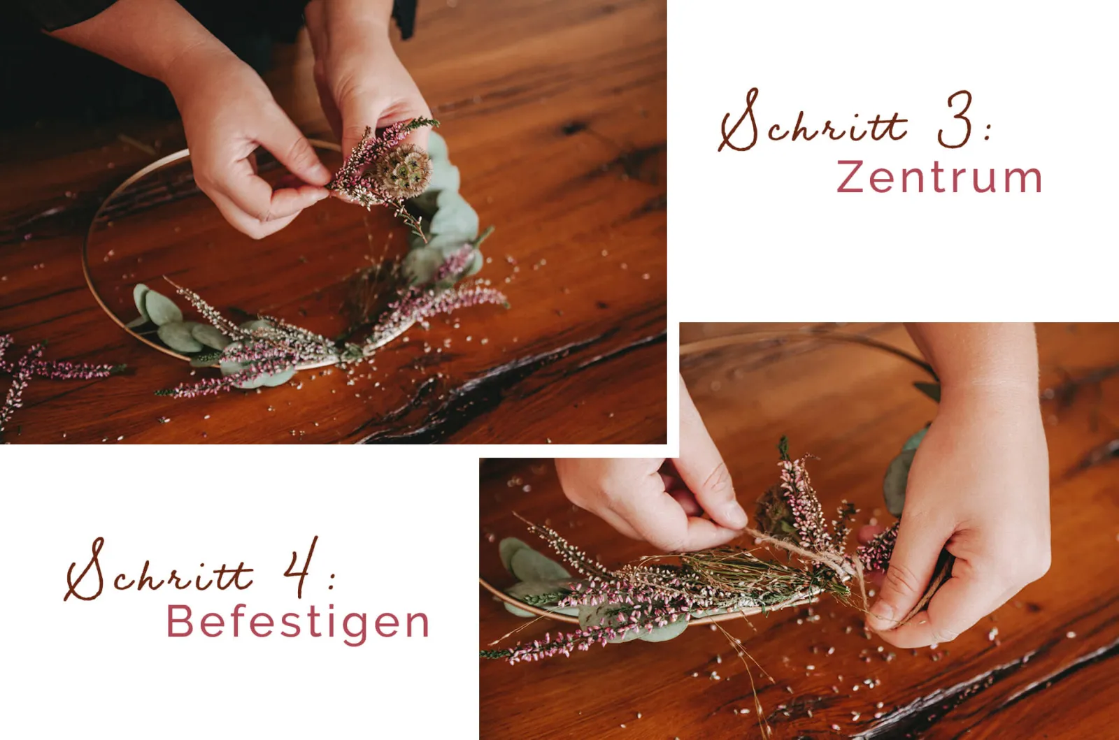 Forme auf die gleiche Weise das Kernstück im Zentrum deines Kranzes. Verwende hierfür eine schöne Blüte, drapierte Gräser und natürlich deine Heide.