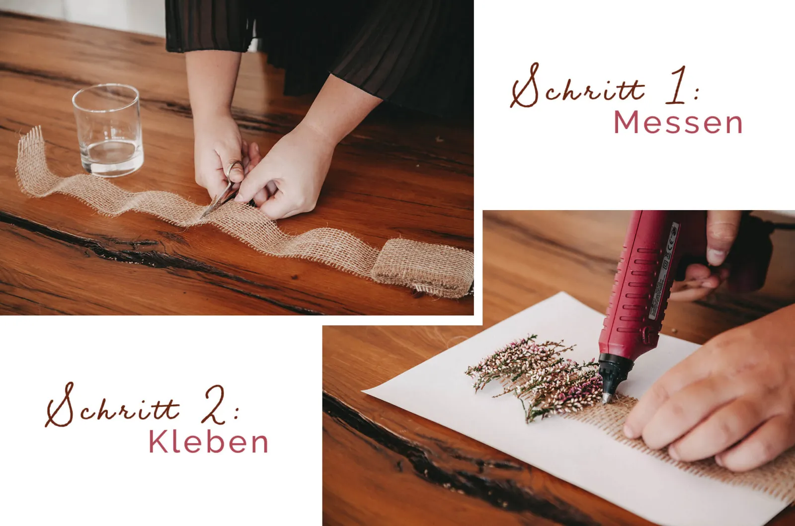 Ziehe nach und nach einen Heißklebesteifen in der Mitte des Dekobandes und platziere der Reihe nach vertikal die Heidestängel darauf. Drücke sie leicht fest, sodass sie gut halten. Spare den Zentimeter Überschuss aus.