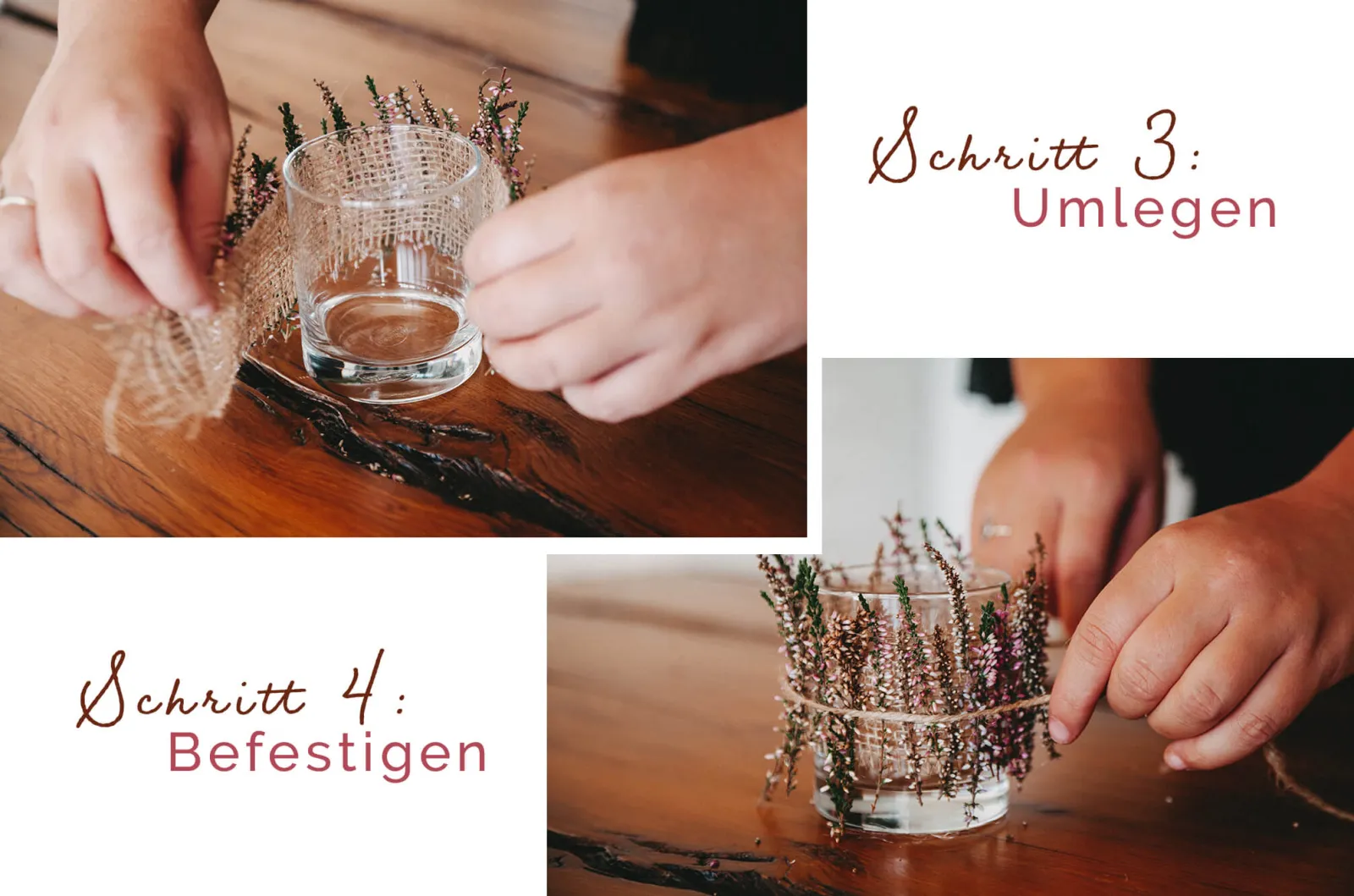 Umwickel das Glas mit dem beklebten Band, gebe etwas Klebe auf den Überschuss und schiebe ihn unter das andere Ende des Bandes und ziehe es so fest, dass dein Band um das Glas festhält.