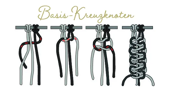 Nun knote, flechte und kordele die vier Stränge des Makramee-Garns je nach Belieben. Eine Anleitung für den Basisknoten, den sogenannten „Kreuzknoten“ gibt dir die obige Grafik. Möchtest du noch weitere Knoten lernen, empfehle ich dir Tutorials bei YouTube, wie dieses hier. Wenn du die Bänder in verschiedenen Längen knotest, entsteht das gestufte Endergebnis, ähnlich zu einem Wimpel.