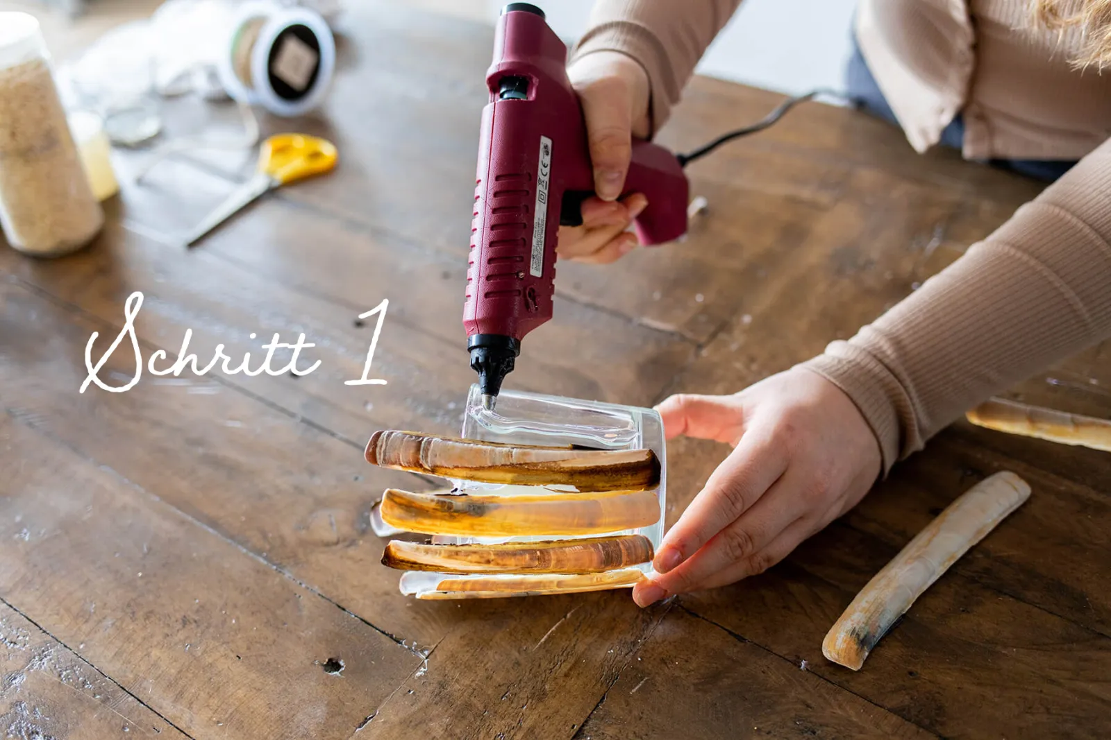 Lass deine Heißklebepistole warm werden und lege dir deine Schwertmuscheln zurecht. Ein dünner Streifen Klebstoff auf dem Glas reicht schon aus, um eine Muschel zu befestigen. Achte darauf, dass die Muscheln mit dem unteren Rand des Glases abschließen, sodass das Teelicht nachher nicht wackelt. Für einen natürlichen Look variiere lange und kurze Muscheln nebeneinander.