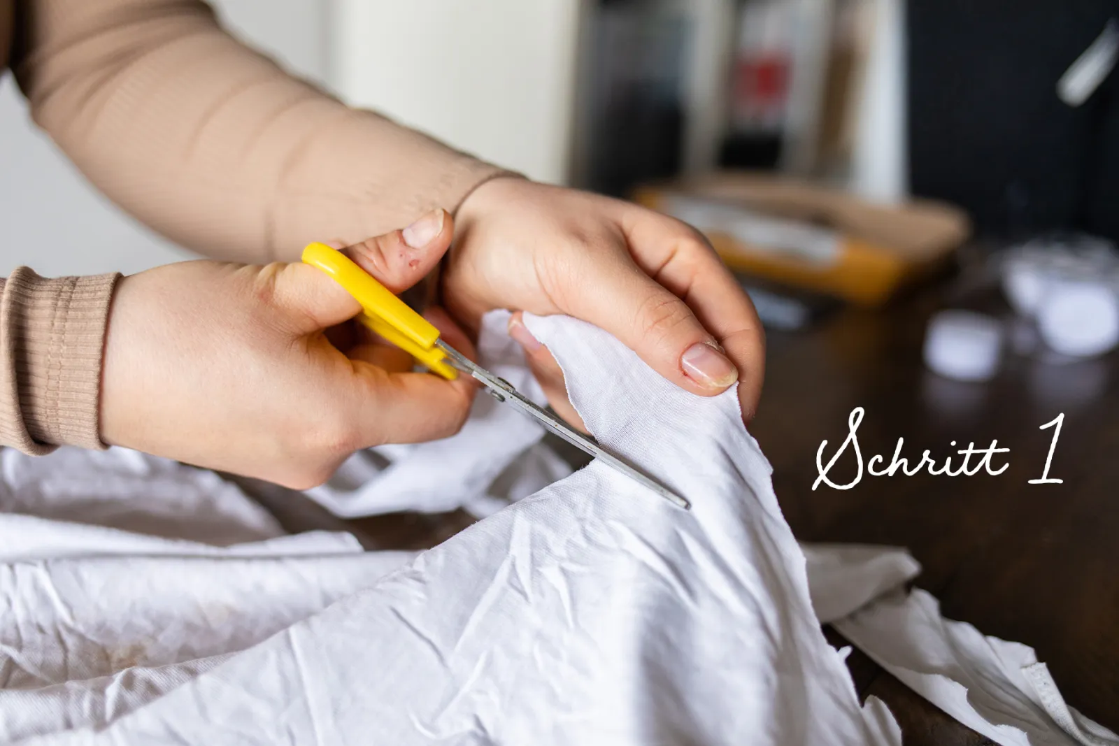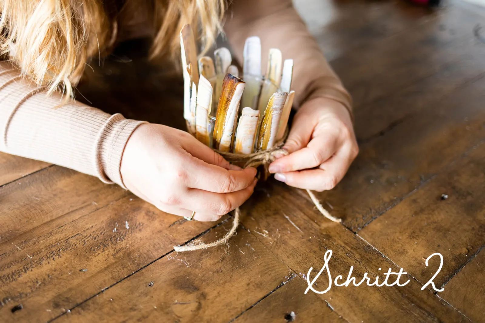 Schneide die Stoffbänder so zurecht, dass sie in der Mitte länger und zu den Rändern kürzer werden. Wenn das eine oder andere geknotete Knotenband nicht ins Gesamtbild passt, kannst du diese jetzt noch vorsichtig am Holz verschieben. Ziel ist es, eine Art Wimpel zu kreieren, also die Form eines Dreiecks, das auf dem Kopf steht.