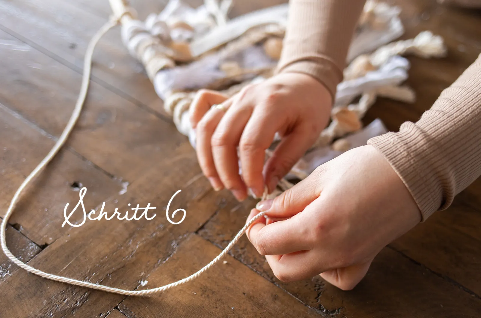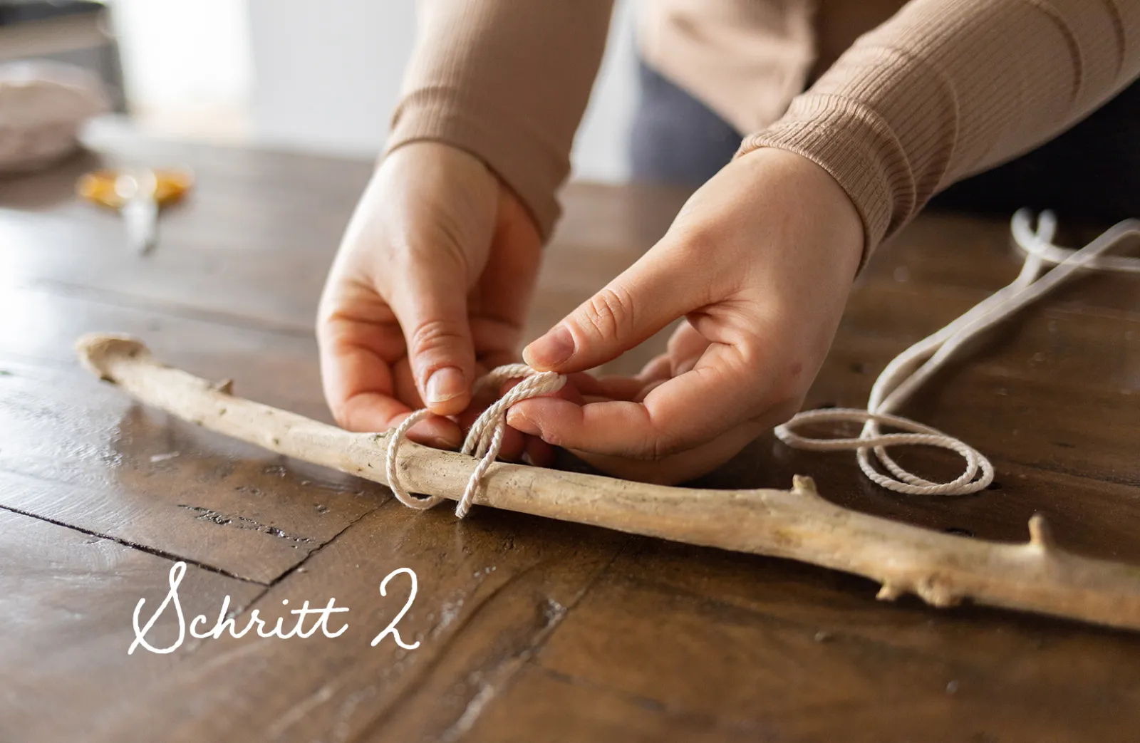 Fast geschafft! Jetzt brauchst du nur noch ein kleines Stück Kordel, an dem du dein Meisterwerk aufhängen kannst. Knote dafür die Kordel an beide Enden des Holzes – hier reicht ein herkömmlicher Doppelknoten aus. Entferne allen Überschuss und hänge das Makramee an deinen Libelingsplatz bei dir zu Hause. Fertig!