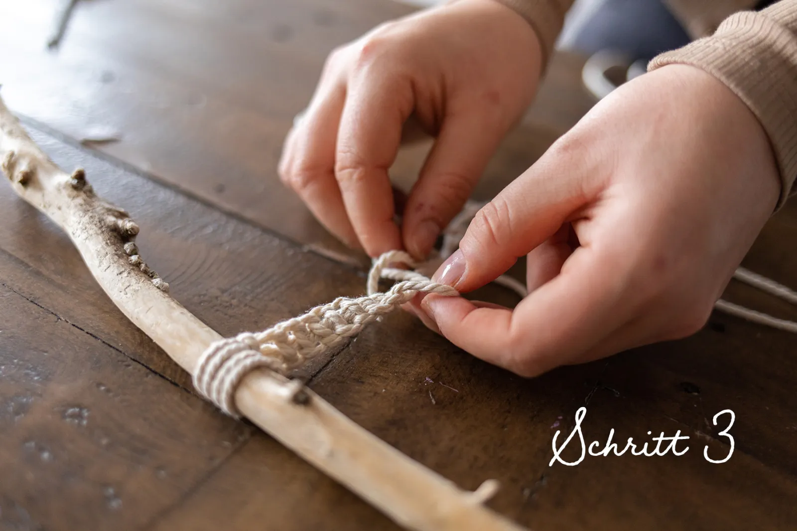 Falte die langen Stoffbahnen in der Mitte, lege die in der Mitte entstandene Öse unter das Holz und ziehe die unteren zwei Ende nun oberhalb des Holzes durch die Schlaufe. Befestige so auch das Spitzenband und das Makramee-Garn, hier musst du nur darauf achten, dass du zwei Schlaufen nebeneinander platzierst, sodass du vier Stränge zum knüpfen hast. Wechsel immer wieder zwischen den verschiedenen Bändern für einen schönen Mix.