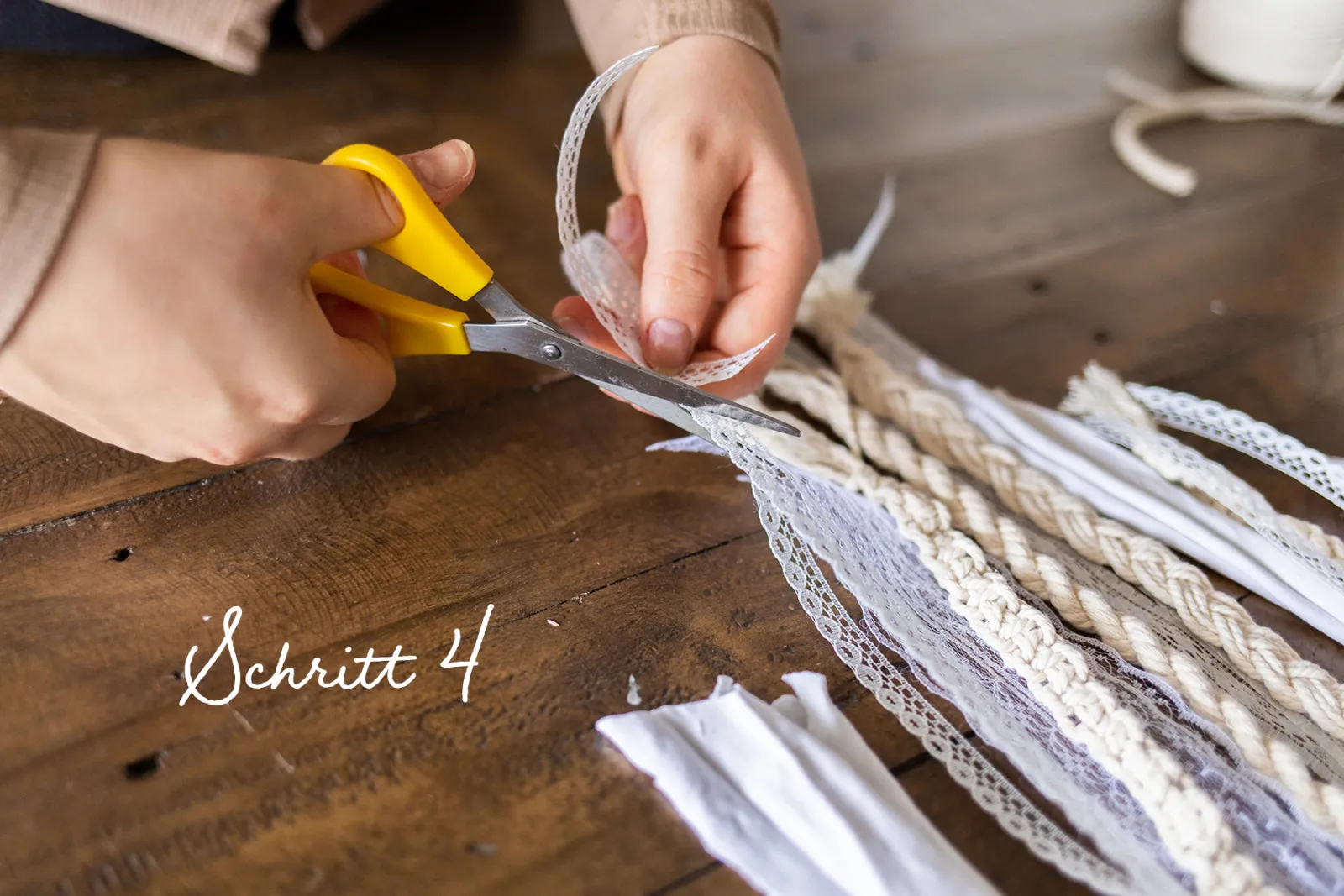 Bring das Stück Treibholz auf die gewünschte Länge. Breche dafür vorsichtig das Holz, was einen schönen rustikalen Look erzeugt, auf den wir abzielen. Schneide deine Stoffreste und Spitzenbänder in lange Streifen. Sei bei dem Makramee-Garn gerne großzügig, da du es noch knoten wirst und dafür sehr viel Länge verloren geht.