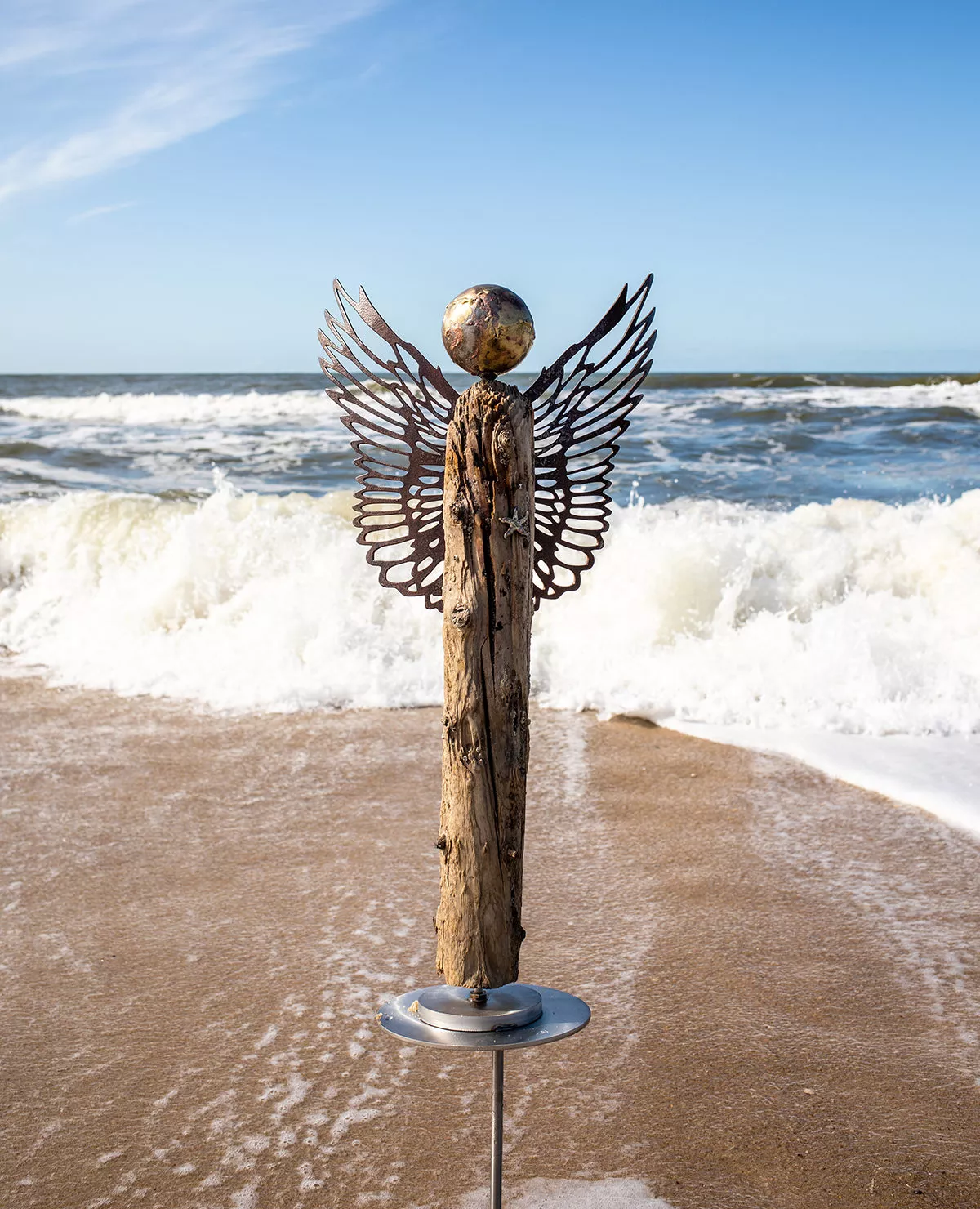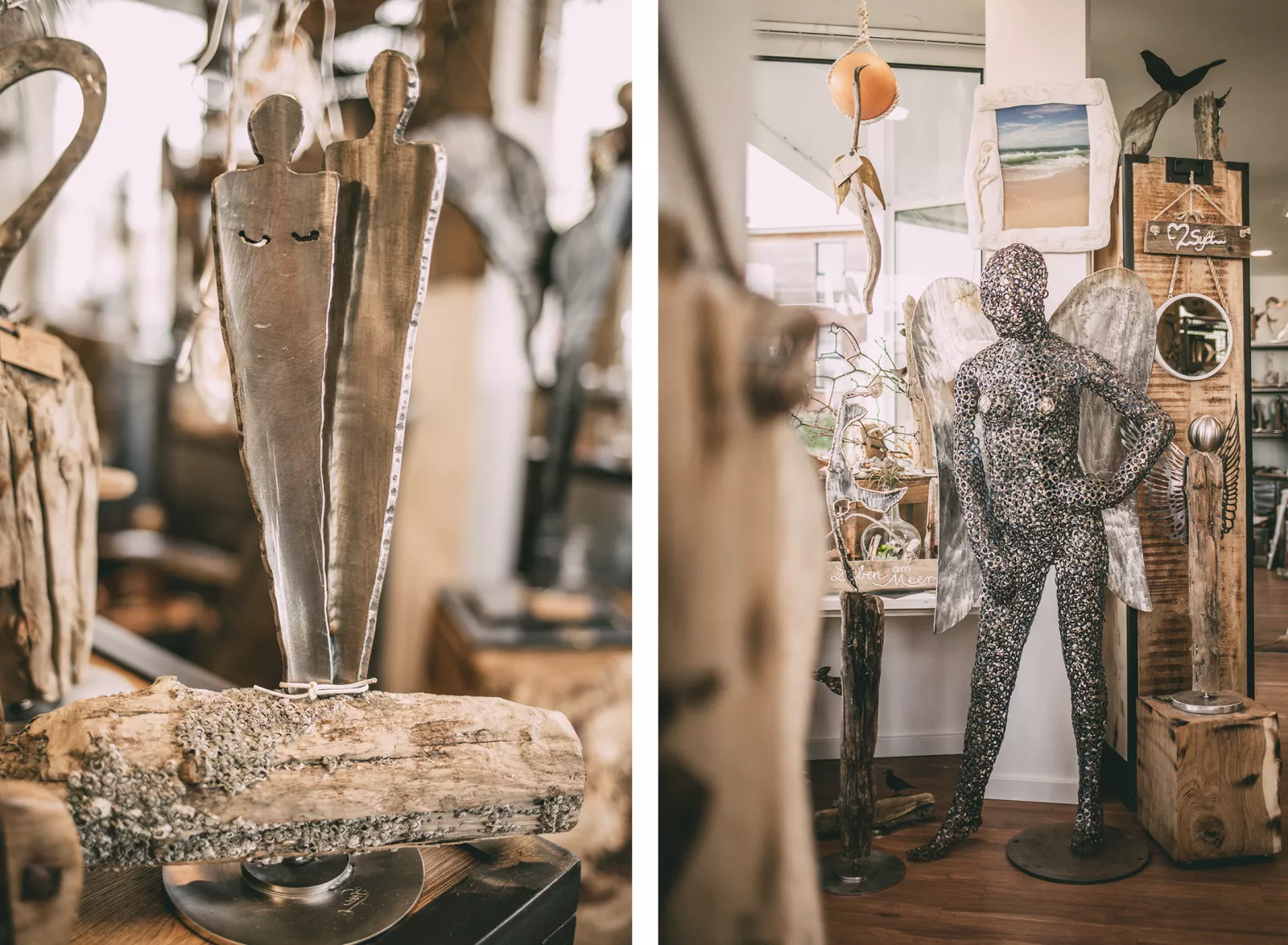 Das Markenzeichen von Fissimo®-Sylt sind allerdings imposante, himmlische Wesen. In ihrer Schmiede in Herford fertigten Frank und Iara schon vor langer Zeit die ersten Engel aus Kaminholz mit Flügeln, Kopf und Fuß aus Metall an. Als Iara und er dann einen angespülten Lahnungspfahl am Sylter Strand fanden, war die Idee des Strandengels geboren.