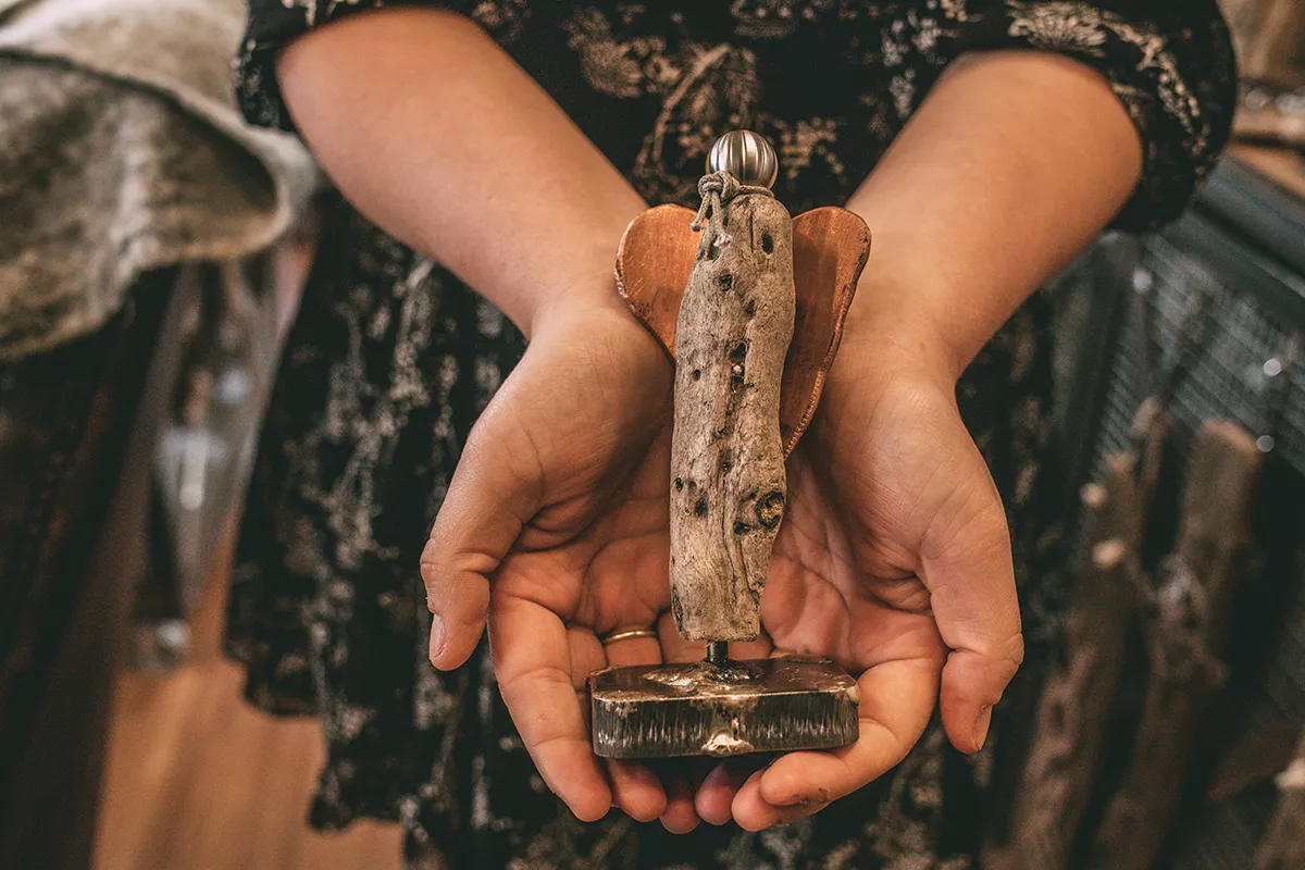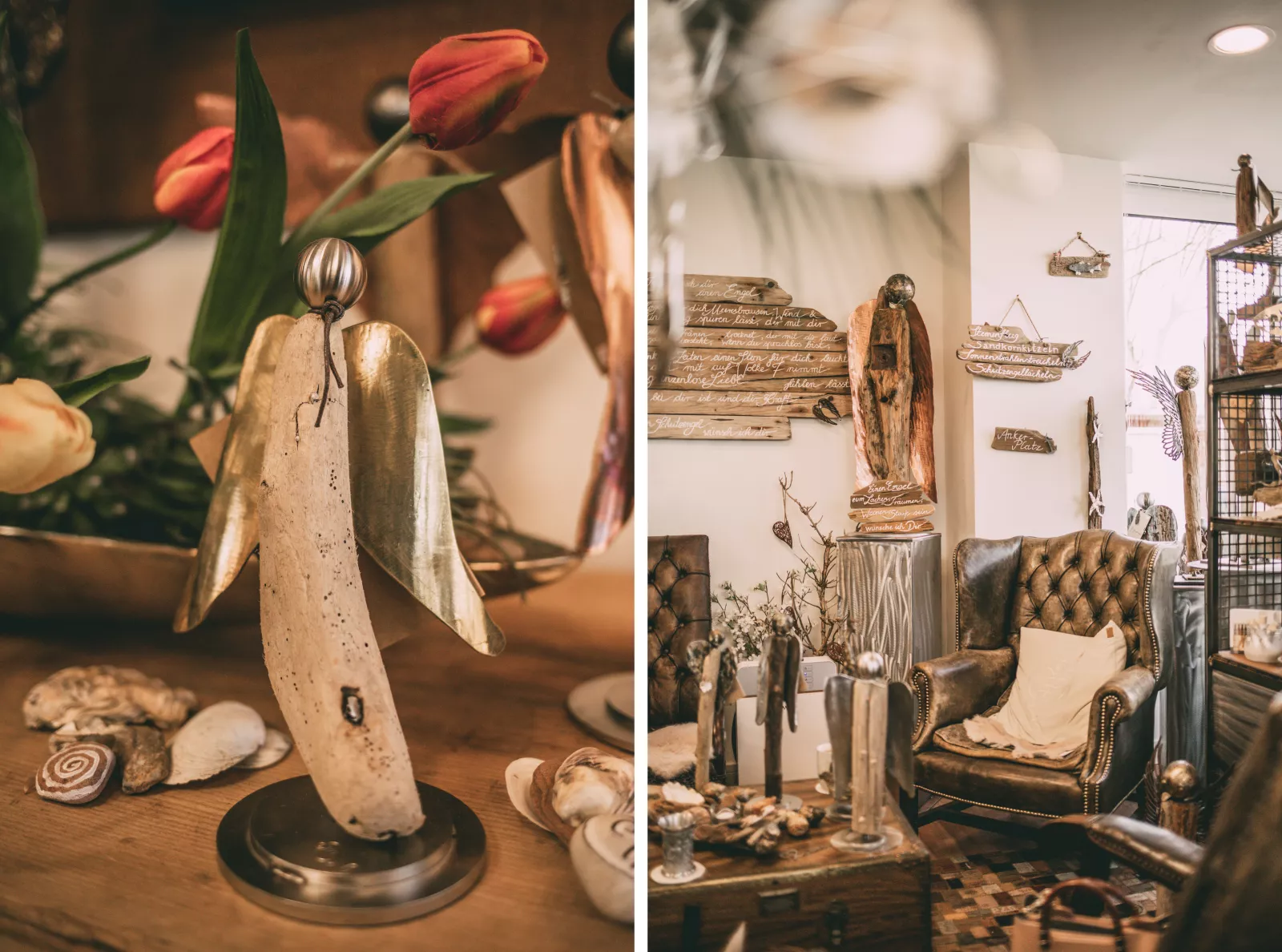 Jeder Engel ist einzigartig und trägt sogar einen eigenen Namen, der samt Koordinaten des Holzfundortes und einer Geschichte auf einem liebevoll gestalteten Kärtchen steht. Und für frisch vermählte Paare gibt es sogar einen Sylter Hochtzeits-Engel! Am liebsten bringt das Paar allerdings die Engel mit ihren neuen Besitzer:innen zusammen und die kommen tatsächlich aus der ganzen Welt.