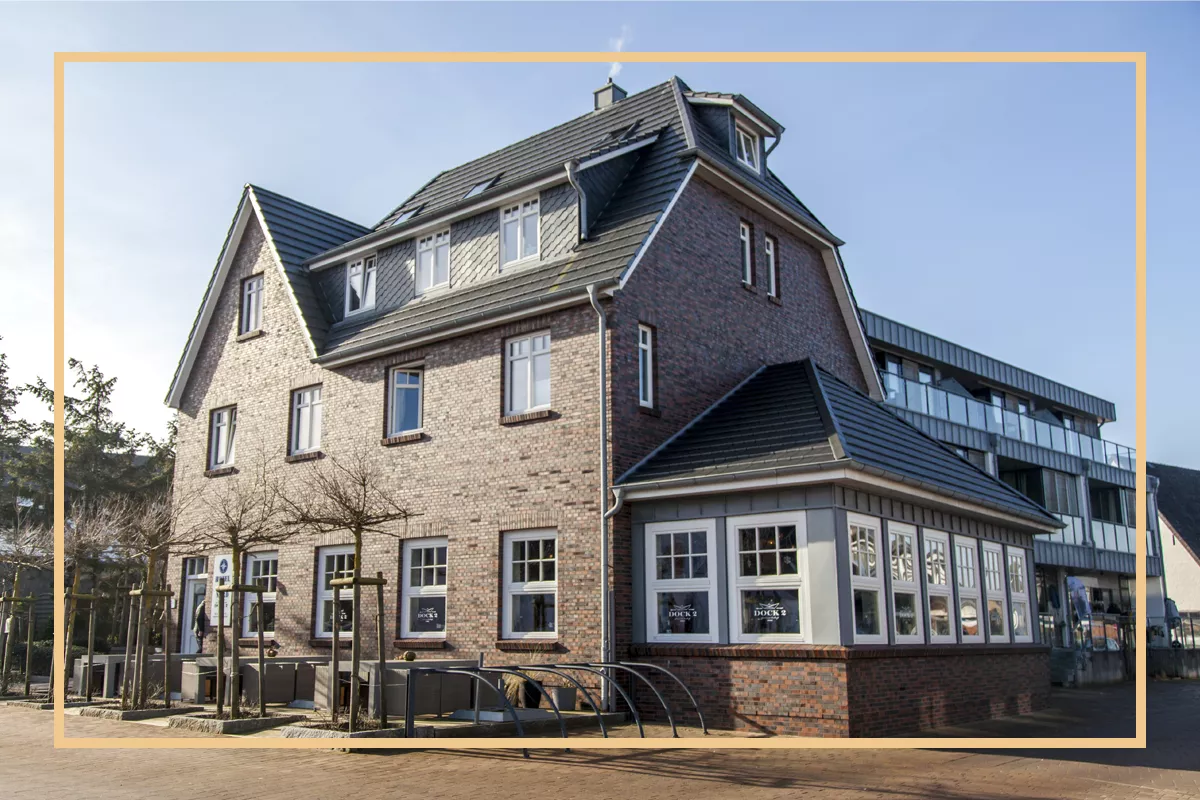 Der Name des Hotels bezeichnet die Lage des Hauses, das wohl das älteste im Ort ist. Das einstige Hapag-Haus, das der Schiffslinie der Rederei Hapag gehörte, war früher einmal Start- und Zielbahnhof der 1888 erbauten Inselbahn „rasende Emma“. Viele Details, Nischen und architektonische Elemente im 2013 eröffneten Hotel erinnern noch an diese Zeit. Schön, dass dem altehrwürdigen Haus so wieder Leben eingehaucht wurde.
