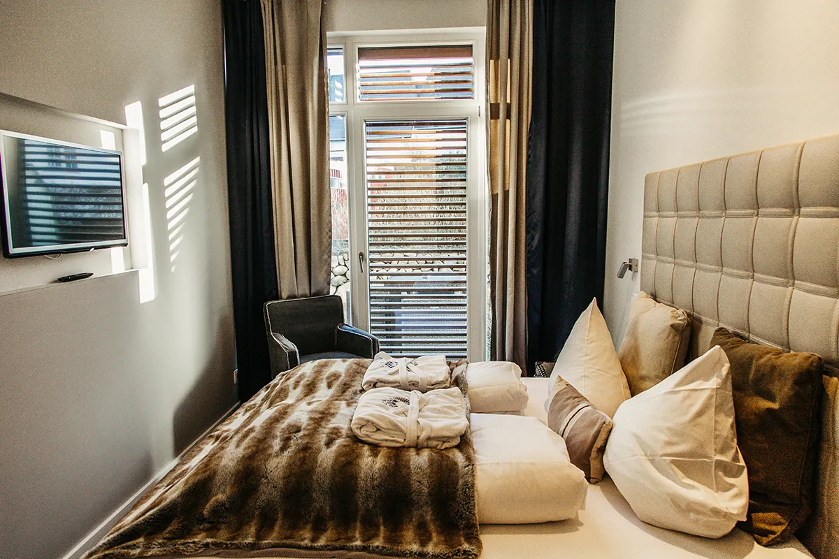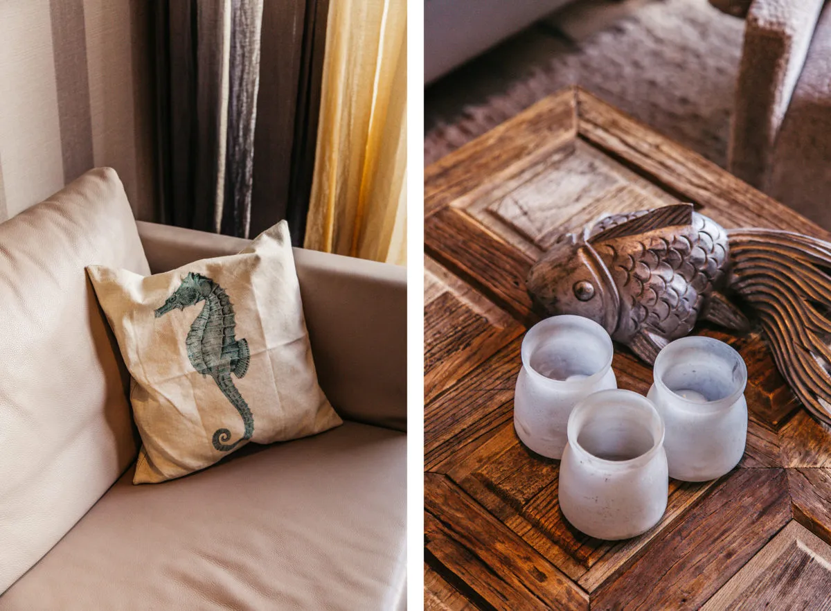 Stilvoll, modern, maritim: Diese drei Worte beschreiben die Einrichtung des Hotels für mich am besten. Denn die charmanten Doppel- und geräumigen Deluxe-Zimmer sind sehr individuell eingerichtet und überraschen mit außergewöhnlichem Design. Nicht zu überladende maritime Details versprühen dabei Urlaubsstimmung. Die Zimmer verfügen über Loggien oder Terrassen mit Strandkorb. Die Deluxe-Zimmer haben sogar eine Einbauküche und einen Esstisch zu bieten, was ich bei einem längeren Aufenthalt super finde!