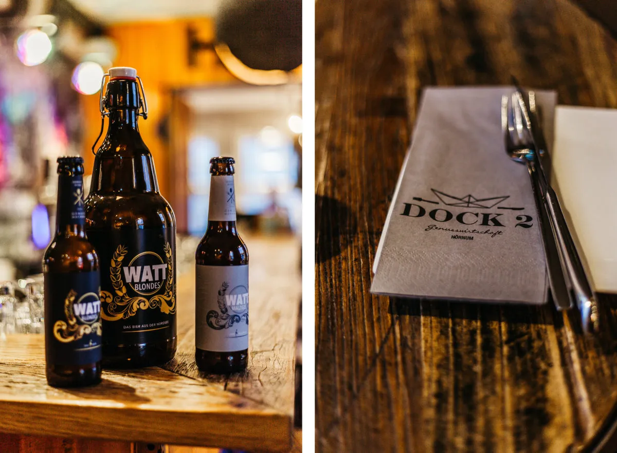 Vom täglichen „Klabautermannfrühstück“ über die Einrichtung im Stil eines Schiffscontainers bis hin zum geselligen Abend bei einer Buddel Wein und regionalen Speisen – die Genusswirtschaft Dock 2 hat mich positiv überrascht. Während meines Aufenthalts habe ich fast jeden Abend in dem stylishen Bistro gegessen. Dort wird mittags sogar eine kleine Tageskarte angeboten. Die Atmosphäre ist herrlich entspannt, das Personal sehr nett und die angenehmen Preise unterscheiden sich vom sonst eher hohen Sylter Niveau. Das mag ich! In den Regalen gibt es zu dem so einige Sylter Spezialitäten zu entdecken, wie zum Beispiel das Bier aus der Sylter Meersalz Manufaktur.