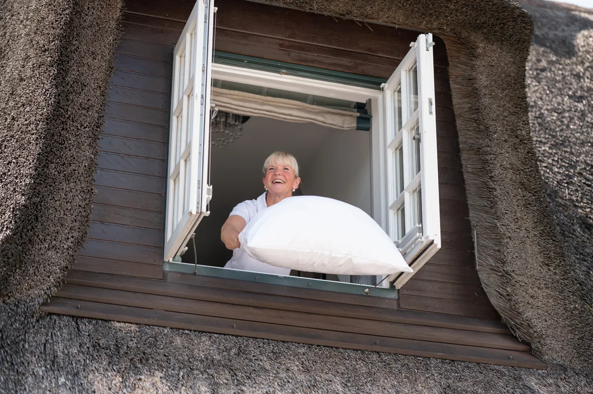 Das imposante Haupthaus des Hotels Strandvogtei Sylt mit seiner weißen Fassade und dem prächtigen Reetdach hat mich schon oft in Staunen versetzt. Nach einer umfassenden Renovierung in diesem Frühjahr ist das Friesenhaus äußerlich seiner traditionellen Optik und Form treu geblieben. Im Inneren hingegen überrascht es mit einer modernen Ausstattung und einem individuellen, stilvollen Wohnambiente. Was mir zudem besonders auffällt, ist die Herzlichkeit des gesamten Teams rund um Hoteldirektorin Birte Clarenbach und Gastgeberin Stephanie Funke. Du wirst hier mit einer großen Portion Gastfreundschaft empfangen und umsorgt.