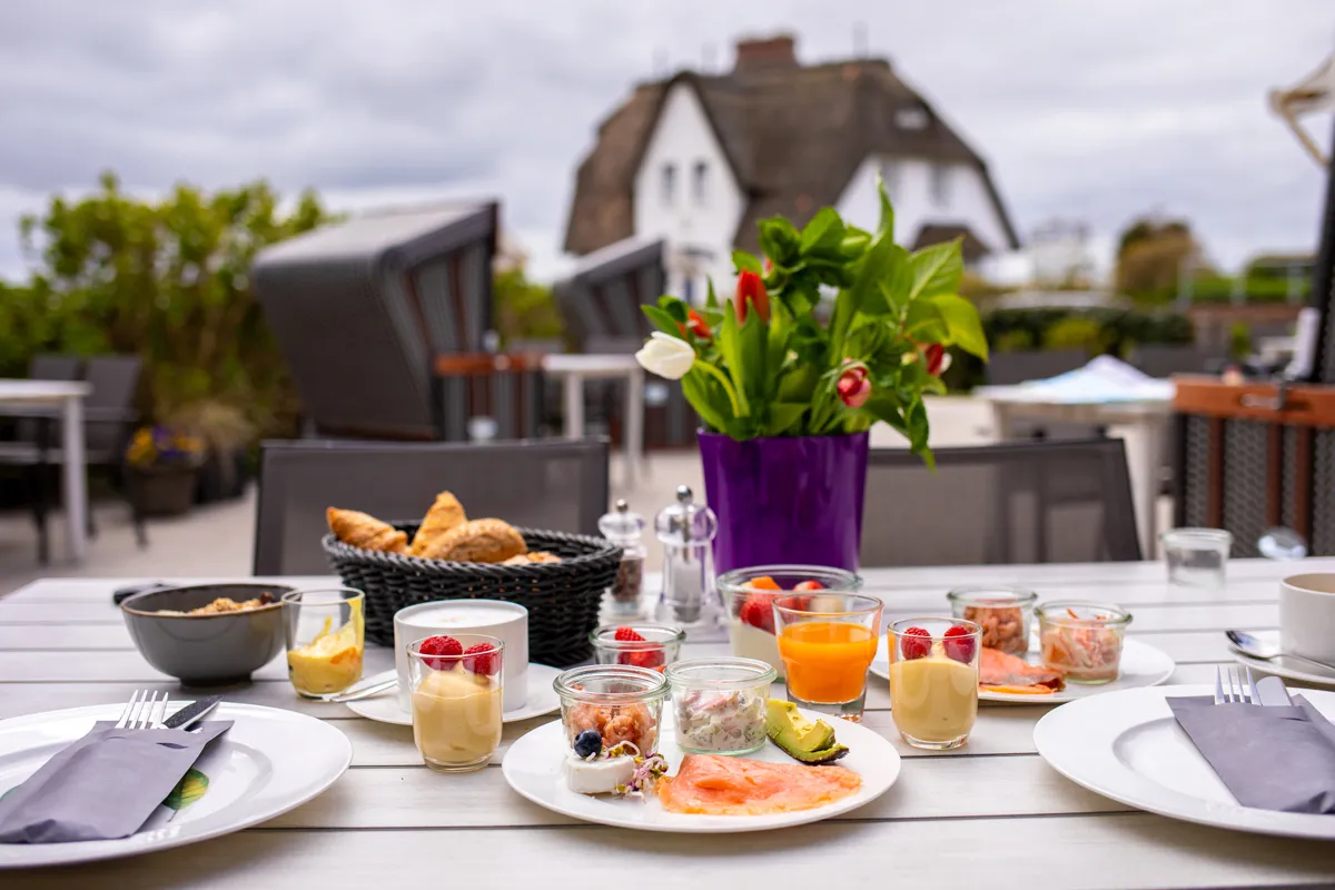 Meine kleine Auszeit im Hotel Strandvogtei kröne ich morgens mit einem reichhaltigen Schlemmerfrühstück. Das Buffet bietet eine große Auswahl an Fischspezialitäten, selbstgemachte Marmeladen, auf Wunsch zubereitete Eierspeisen sowie Quark- und Frischkäsesorten, frische Käse- und Wurstspezialitäten und den legendären Blaubeerpfannkuchen. Dazu duften ofenfrische Brötchen von der Bäckerei Ingwersen aus Morsum und leckeren Kaffee. So startet man gerne in den Tag!