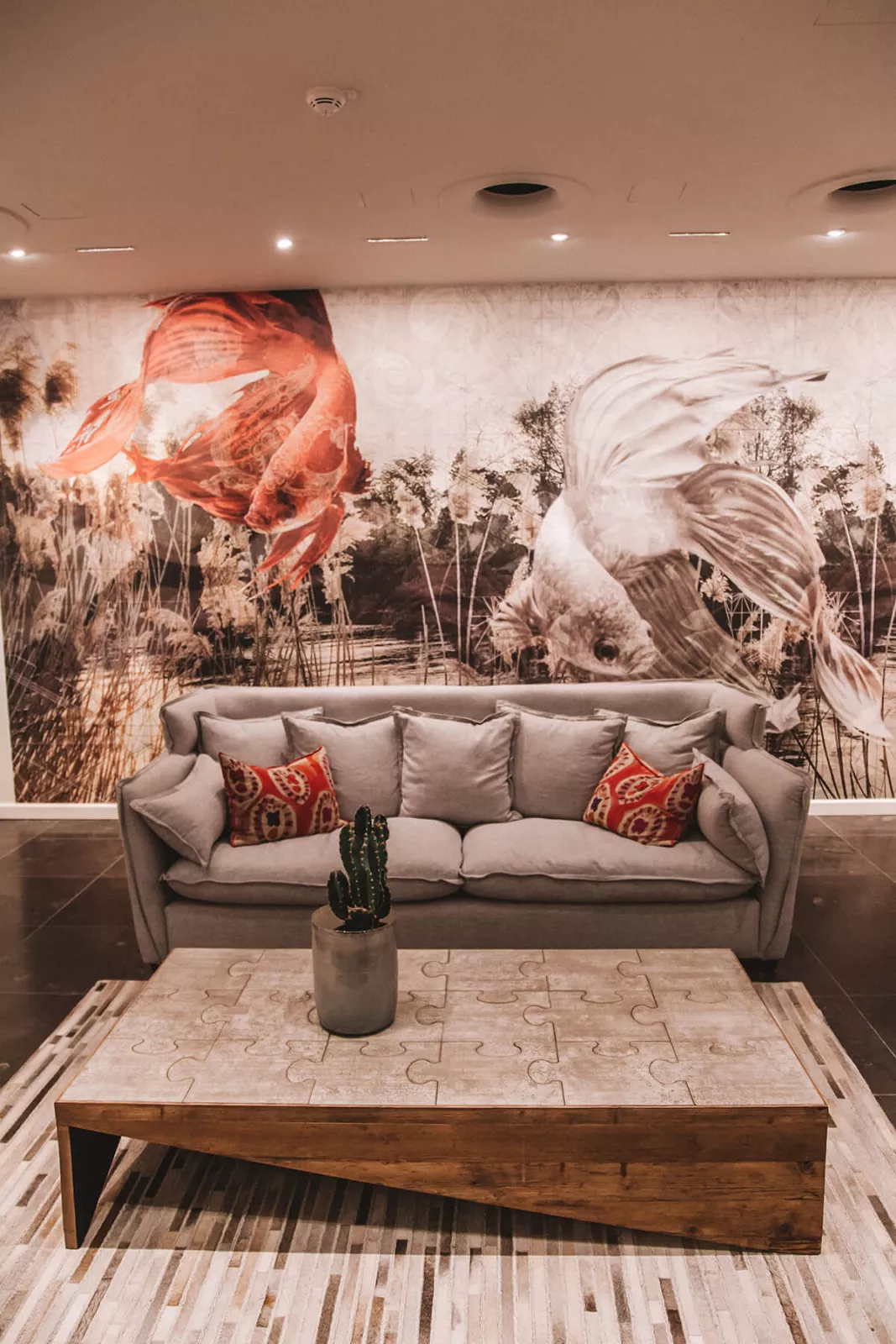 Als ich das Hotel Easy Living zum ersten Mal betrete, staune ich nicht schlecht. Ich finde mich in einer echt stylisch eingerichteten Lobby wieder. Die Wände sind mit Designtapeten verziert, auf denen gigantische rote und graue Goldfische schwimmen. Hinzu kommen große Sofas, rustikale Massivholztische und ausgefallene Sessel. Ein sehr modernes Interieur, das man so auf Sylt nicht oft sieht.