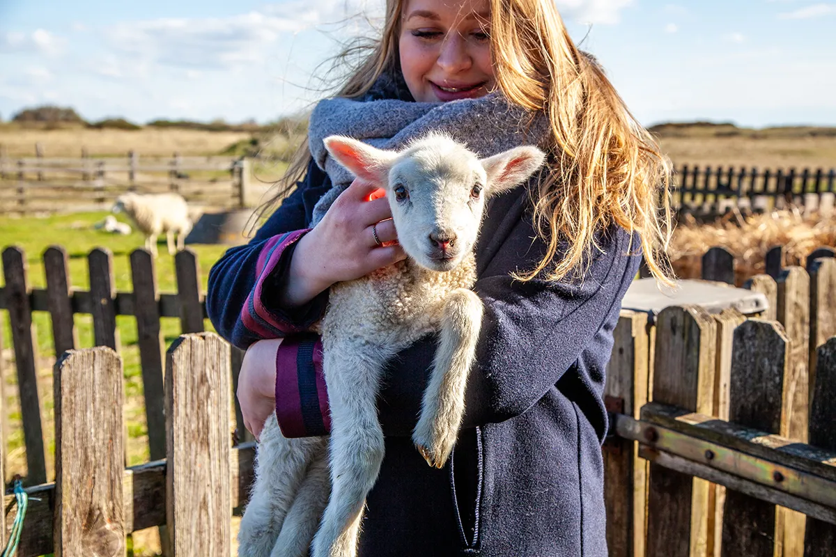 Am Ende hat Jürgen noch eine besondere Überraschung für mich. Zusammen mit meiner Kollegin Lene darf ich in seiner Scheune die frisch geborenen Lämmchen begutachten. Aneinander gereiht wurden in der ganzen Lagerhalle Boxen errichtet, aus denen uns jetzt verschlafen Schafe und winzige Fellknäule entgegen blicken. Ganz hingerissen von der Szenerie merken wir zunächst nicht, dass Jürgen mit einem Lämmchen im Arm auf uns zukommt. Lotte ist ein Flaschenlamm, wurde von der Mutter abgewiesen und muss per Hand groß gezogen werden. Vorsichtig nehmen wir das niedliche Wesen in die Arme, ganz entzückt von dem Anblick.