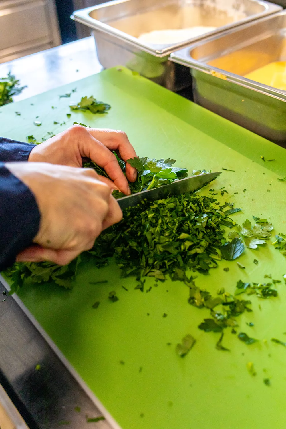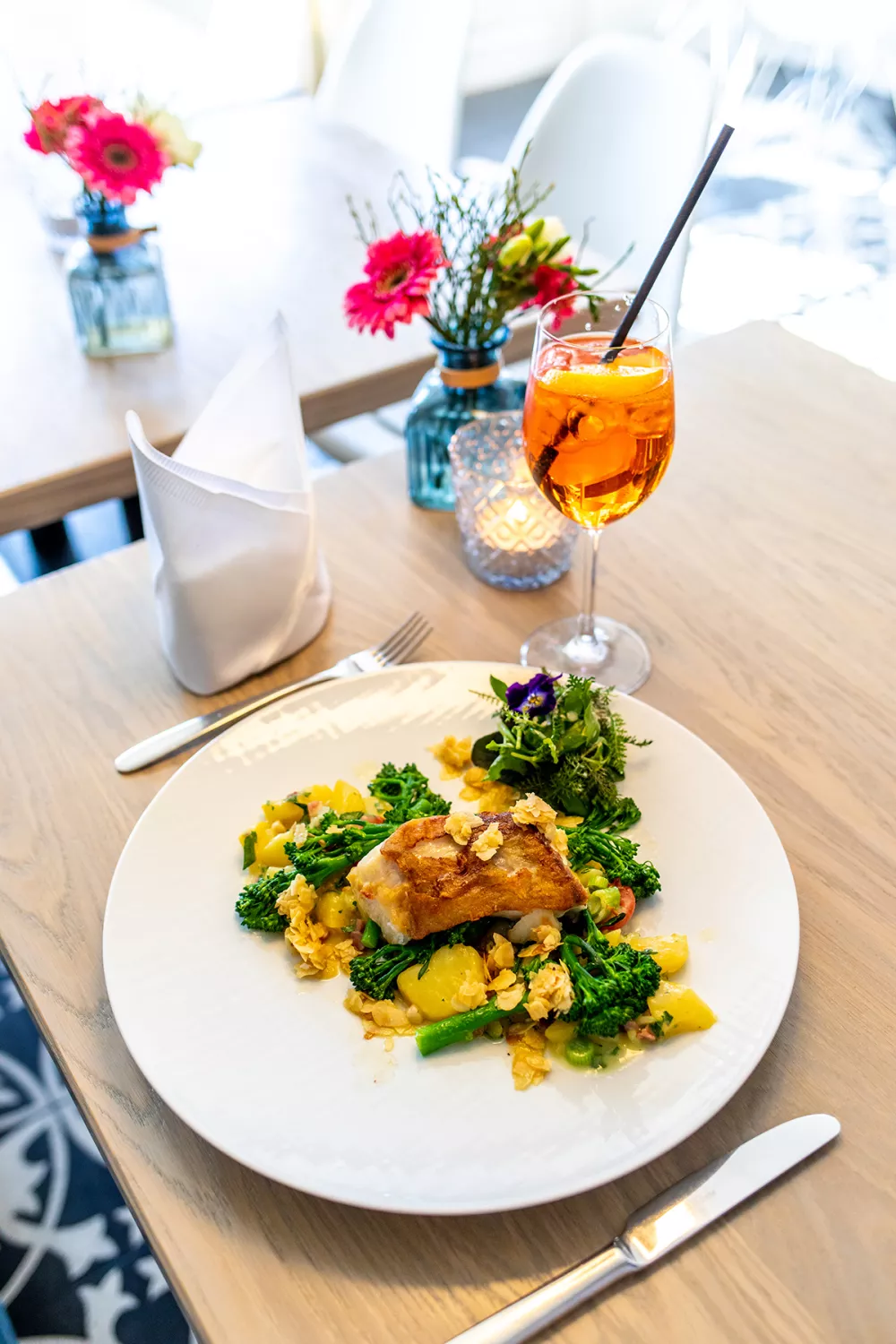 Küchenchef Steffen Meier und sein Team zaubern dir mit viel Liebe und Hingabe kleine und große Gaumenfreuden, bei deren Zubereitung du dank des offenen Küchenbereichs sogar zuschauen kannst. Probier doch mal das Kalbsgulasch mit Spätzle und Salat, das gebratene Dorschfilet auf sautiertem Blattspinat, mit Dijon-Senfsauce und gebutterten Sylter Kartoffeln oder wie wäre es mit der veganen gebratenen Aubergine auf Tomatensugo und Couscous-Salat?