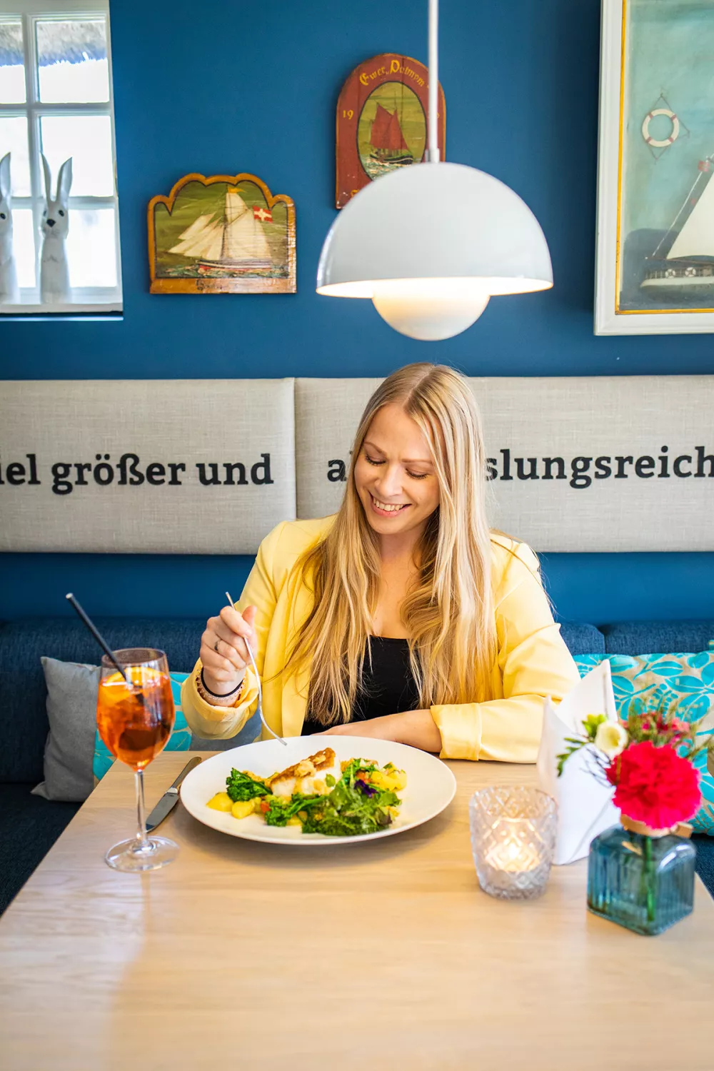 Im Restaurant Kaamp Meren haben mich neben der fantastischen Küche und dem lockeren Ambiente vor allem die Gastgeber*innen selbst beeindruckt. Mit viel Herz und Leidenschaft kümmern sich Beate und Werner „Muffel“ Stoltenberg um ihre Gäste. Hier kannst du entweder eine leckere Pause im Bistrobereich einlegen oder dich ausgiebig kulinarisch verwöhnen lassen.