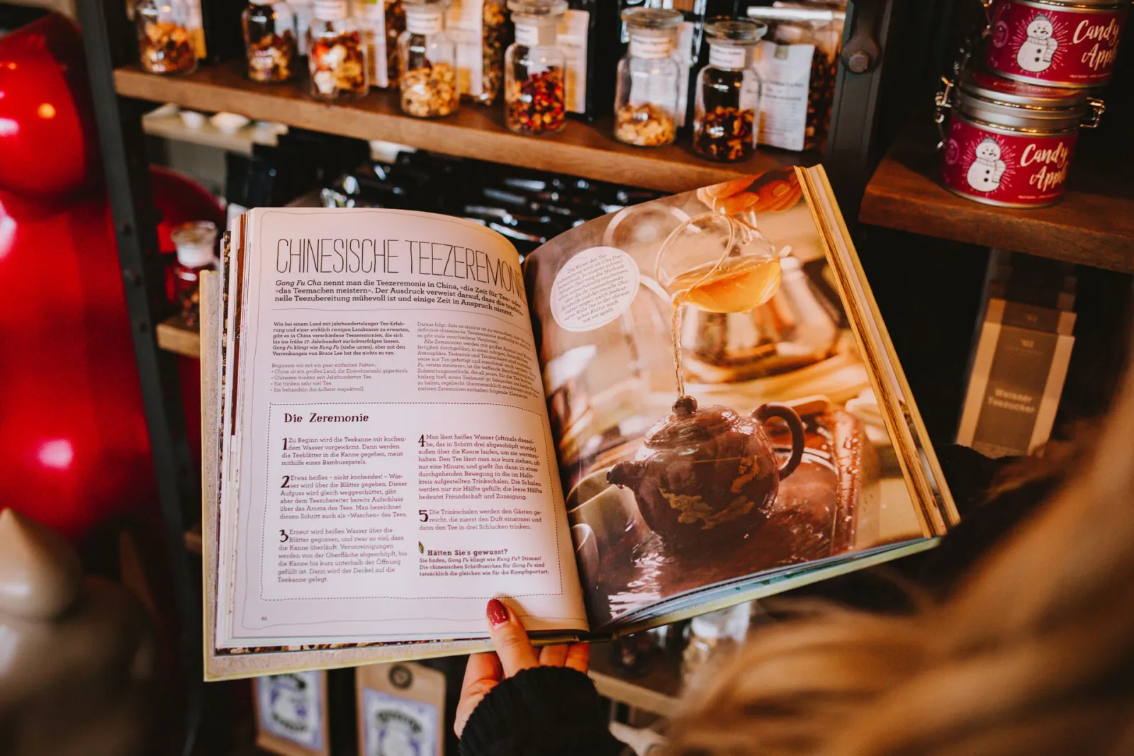Besonders interessant finde ich den sogenannten „Gelben Tee“, eine Rarität, die wohl von Mönchen nach einer geheimen Methode hergestellt wird. Es gibt sogar einen Tee mit Räuchergeschmack, den man zum Kochen verwenden kann. „Tee eignet sich nicht nur zum Trinken. Bei uns im Teeraum bieten wir auch Desserts und Speisen an, die wir damit verfeinern wie zum Beispiel die Scones mit Tee-Gelee“, verrät May.