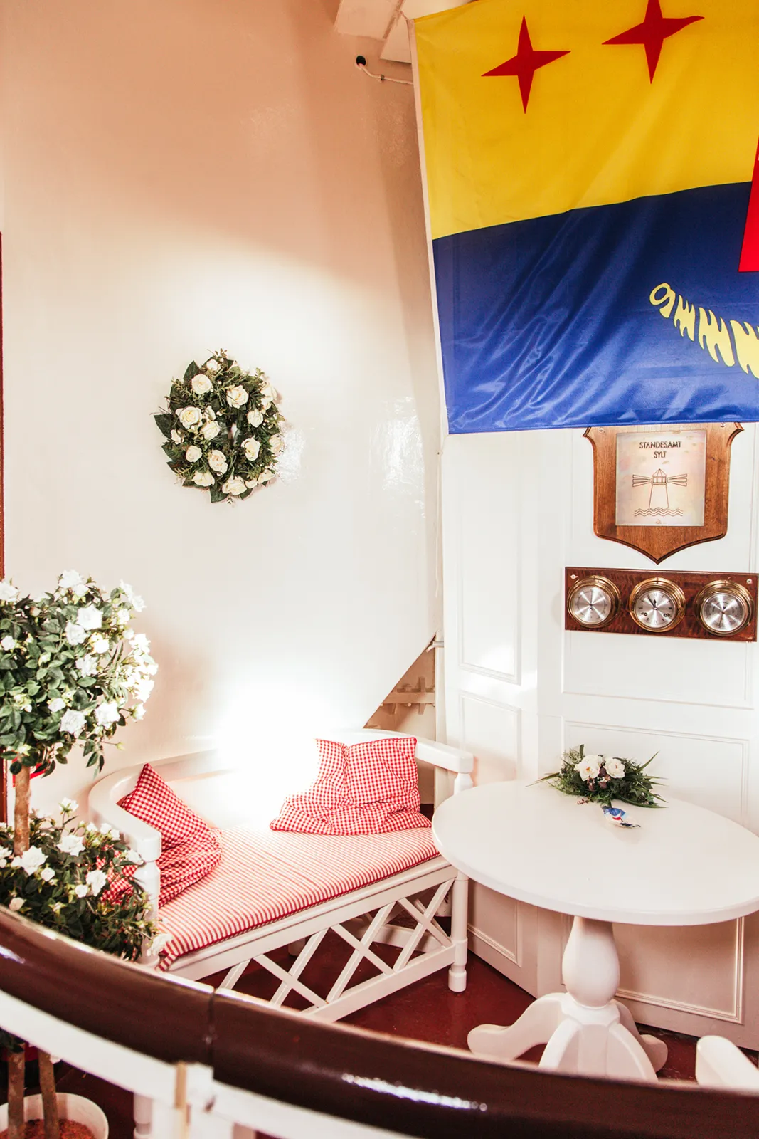 Eine Etage höher befindet sich das Trauzimmer, das seit 2002 für Hochzeiten genutzt wird. Mit nur neun Plätzen für Gäste bietet es eine intime und romantische Atmosphäre. Knud erzählt schmunzelnd, dass hier noch nie jemand „Nein“ gesagt hat.
