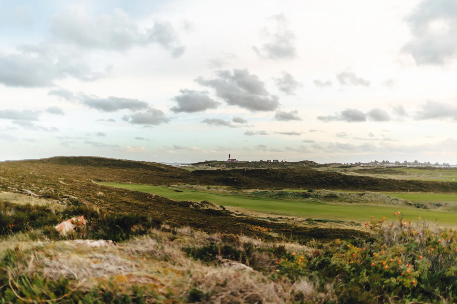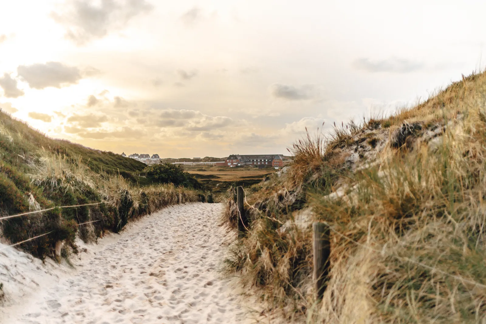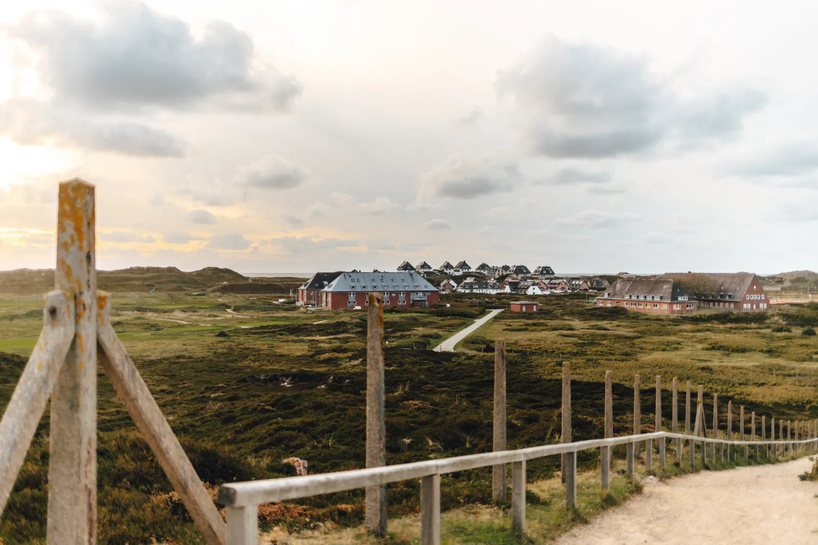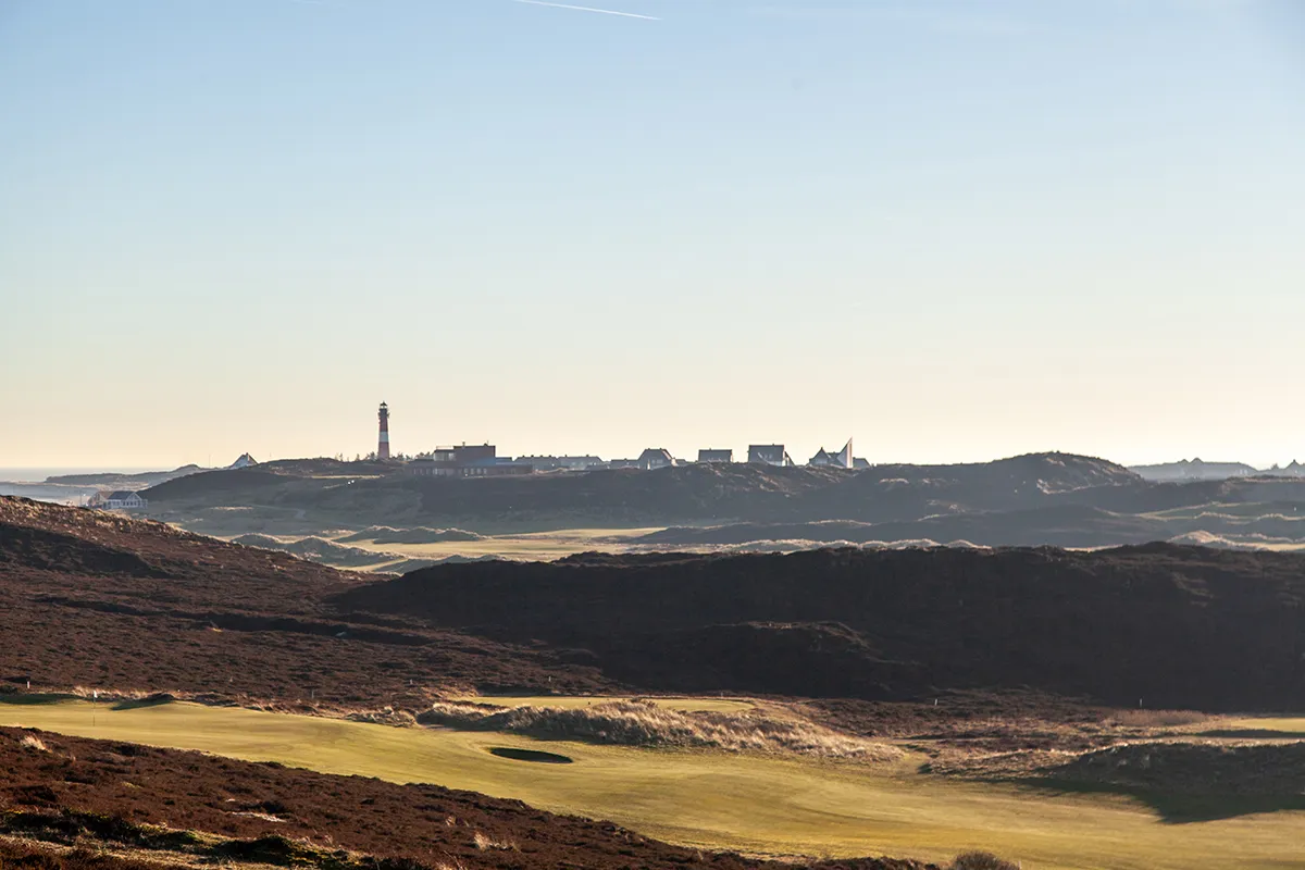 Folge dem Pfad an einem alten, rostigen Zaun entlang die Düne hinauf. Und siehe da: Die Aussicht ist einfach grandios. Vor dir breitet sich das Schleswig-Holsteinische Wattenmeer aus, während hinter dir die Hörnumer Skyline mit ihrem ikonischen Leuchtturm und der St. Thomas Kirche in die Höhe ragen. Links von dir schimmert die Nordsee zwischen den Reetdachhäusern hindurch. Glaub mir, dieser 360-Grad-Blick ist einfach zum Verlieben. Hinter dem Zaun erstreckt sich übrigens der Golfplatz vom Golfclub Budersand.