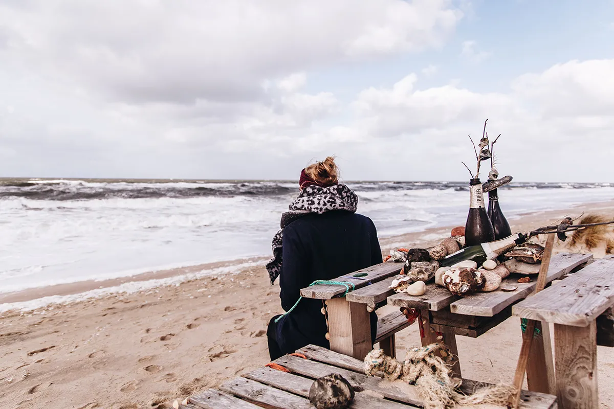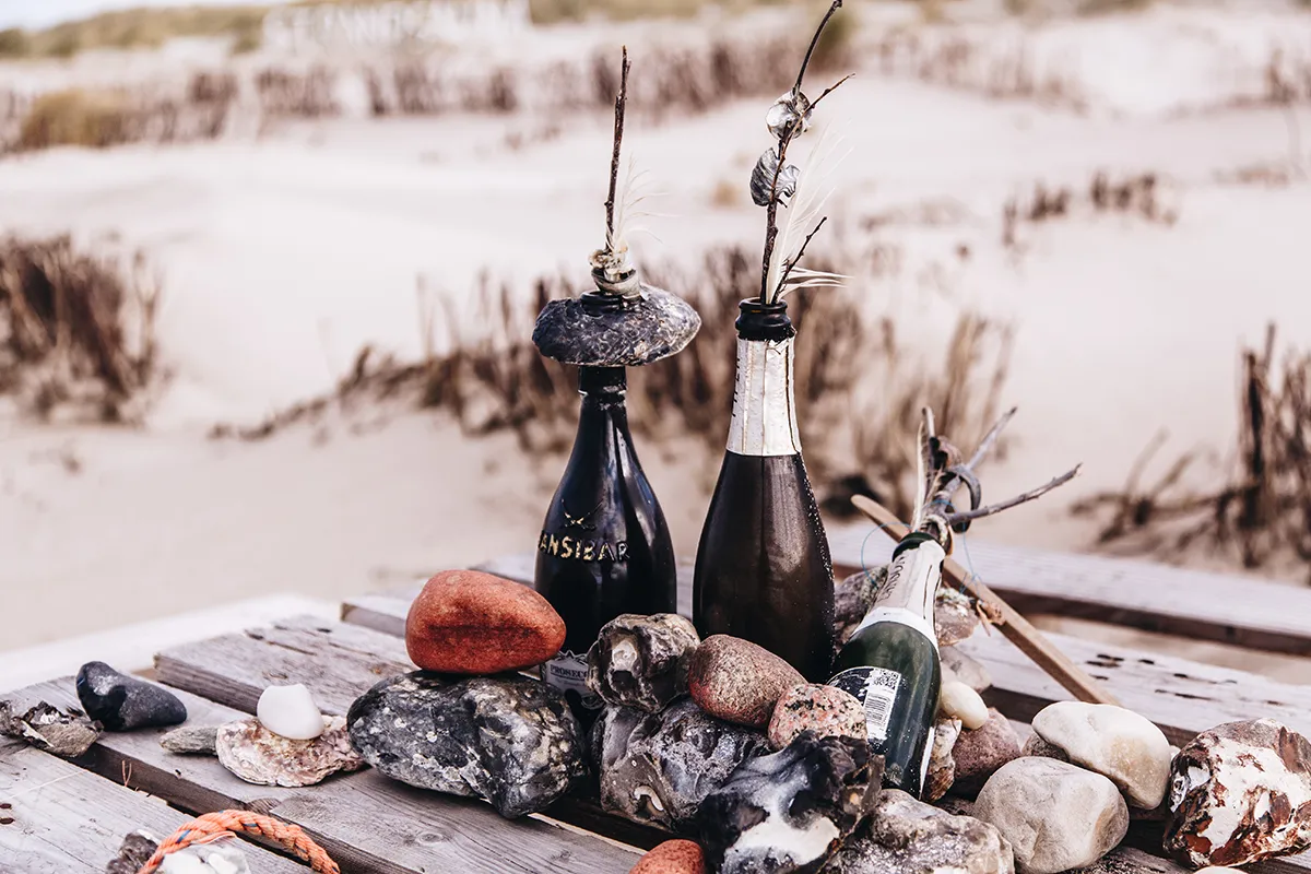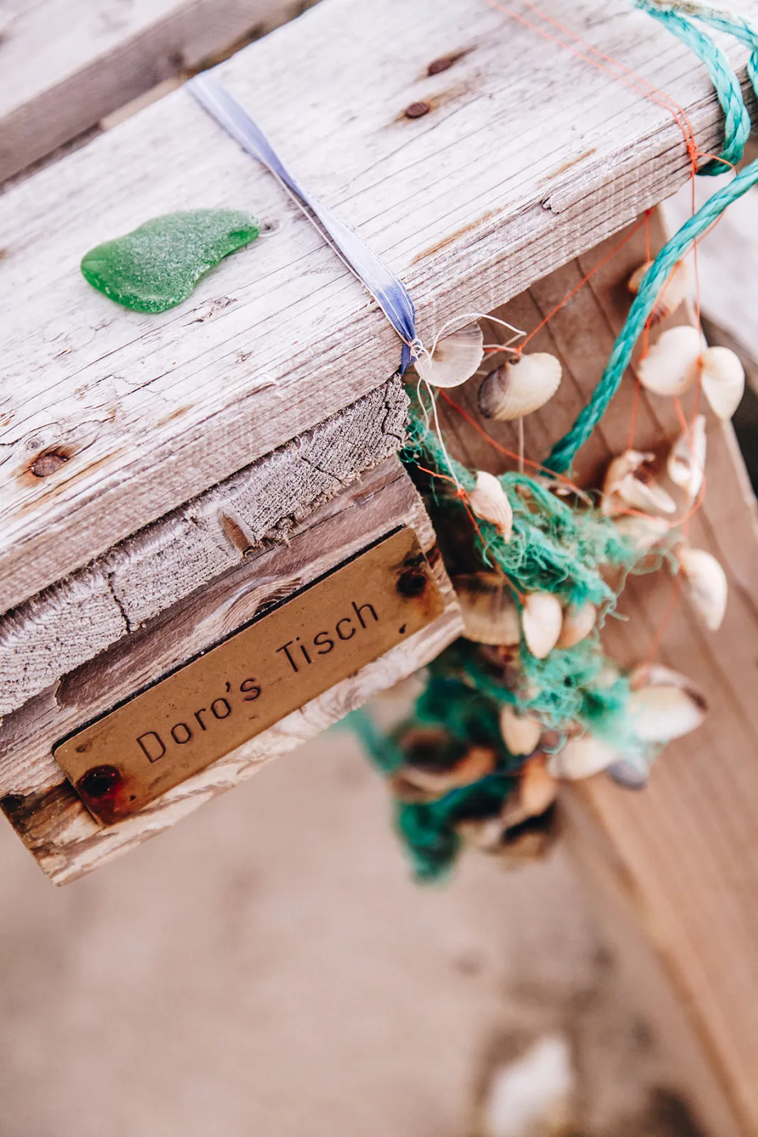 Während ich das Gefühl habe, mich am Rande der Welt zu befinden, entdecke ich plötzlich einen gedeckten Tisch am Dünenrand. Ein Palettentisch mit Bänken, auf dem sandgefüllte Champagnerflaschen stehen und an dem Muschelketten und Tampen baumeln. Ein Schild verrät, wem dieses maritime Kunstwerk gehört: „Doro’s Tisch“. Ist es nicht toll, dass jemand mit so viel Liebe ein Plätzchen gestaltet, an dem sich alle Strandspaziergänger erfreuen können? Wer auch immer Doro ist, ich würde sie gerne kennenlernen. (Wenn du das liest, melde dich bei mir 🙂 )
