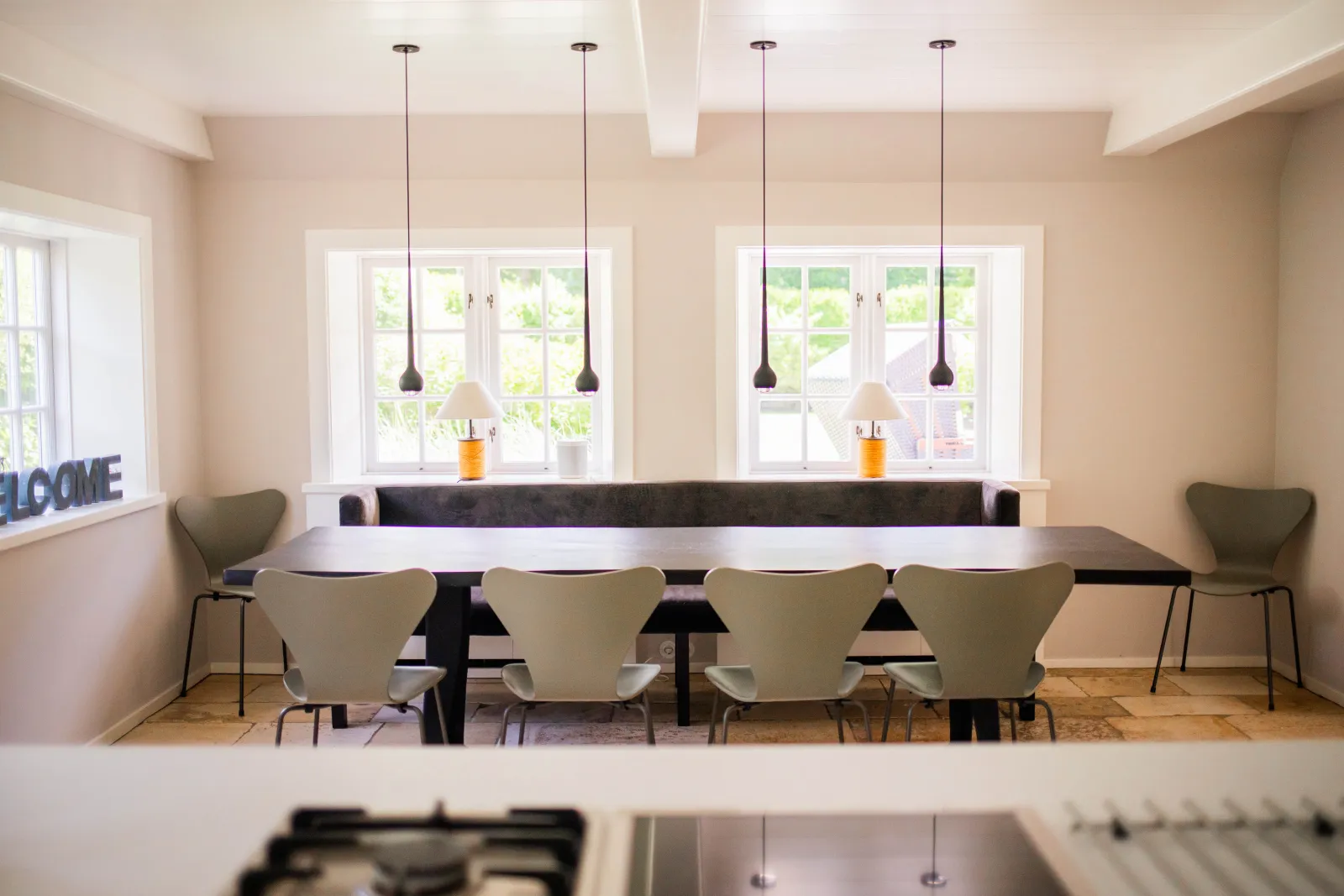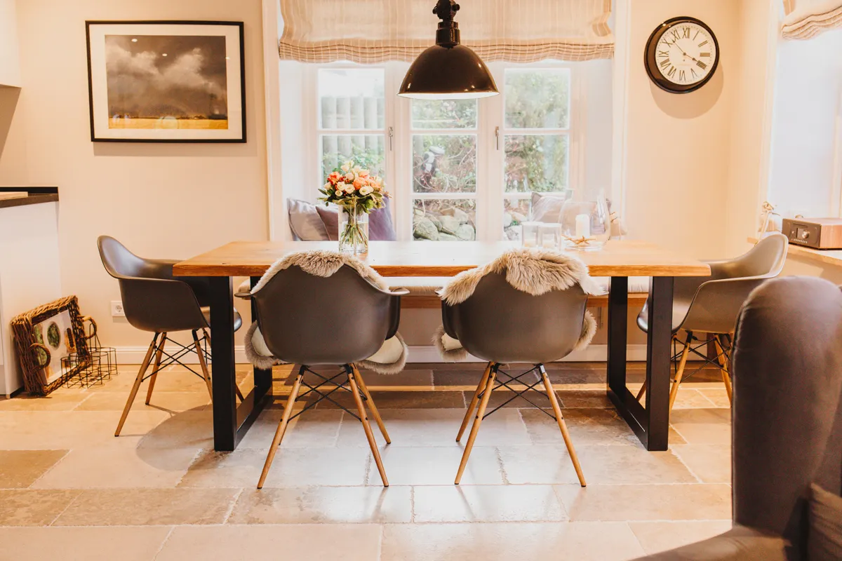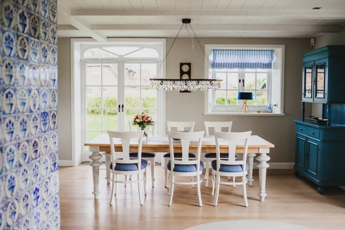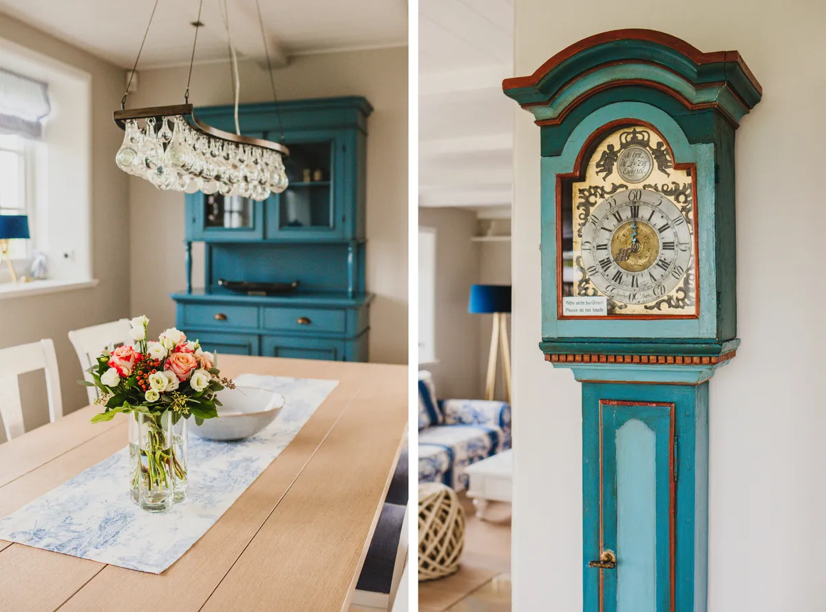 Friesischer Charme trifft Moderne – so würde ich das Einrichtungskonzept des Ferienhauses beschreiben. Delfter Fliesen, ein offener Kamin und eine urige Standuhr sorgen für eine behagliche Atmosphäre. Im Kontrast dazu stehen modische Lampen, die neue Küche und hochwertige Tischlereinbauten.