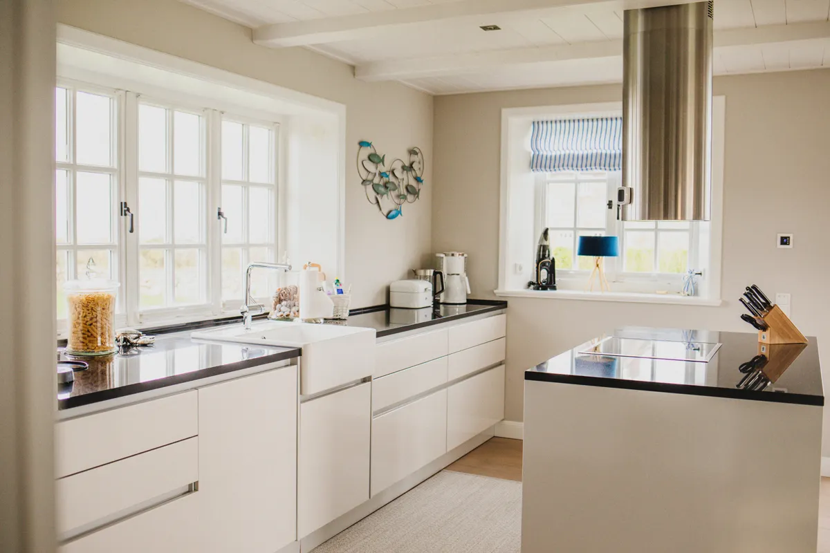Erst im Frühjahr 2022 wurde das 5-Sterne-Ferienhaus aufwendig und liebevoll ausgestattet. Ich mag hier besonders die helle Farbgestaltung des lichtdurchfluteten Wohn-und Esszimmerbereichs. Mir gefällt der feminine Touch, den die freundlichen Rosatöne dem Raum verleihen. Gekonnt platzierte Wohnaccessoires und der offene Kamin sorgen dazu für ein gemütliches Flair. Die offene, top moderne Küche hätte ich am liebsten in meiner eigenen Wohnung. Hier kochst du übrigens mit Wattblick!