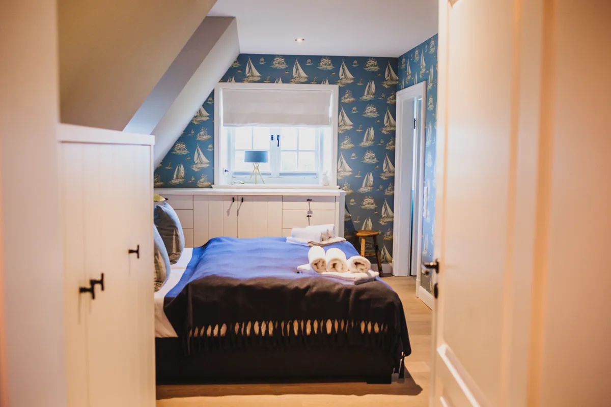 Auf der großen Sonnenterrasse verfalle ich sofort in einen Tagtraum, in dem ich Stunden damit verbringe, dort zu sitzen, die frische Wattluft zu genießen und ein gutes Buch zu schmökern. Es ist so ruhig, als ob die Zeit stillzustehen scheint – so geht Urlaub! Die zwei Schlafzimmer auf der ersten Etage bieten einen wundervollen Blick aufs Watt und in die grüne Umgebung, daneben stehen die zwei Bäder samt Badewanne und Sauna für passende Wellnessmomente bereit.