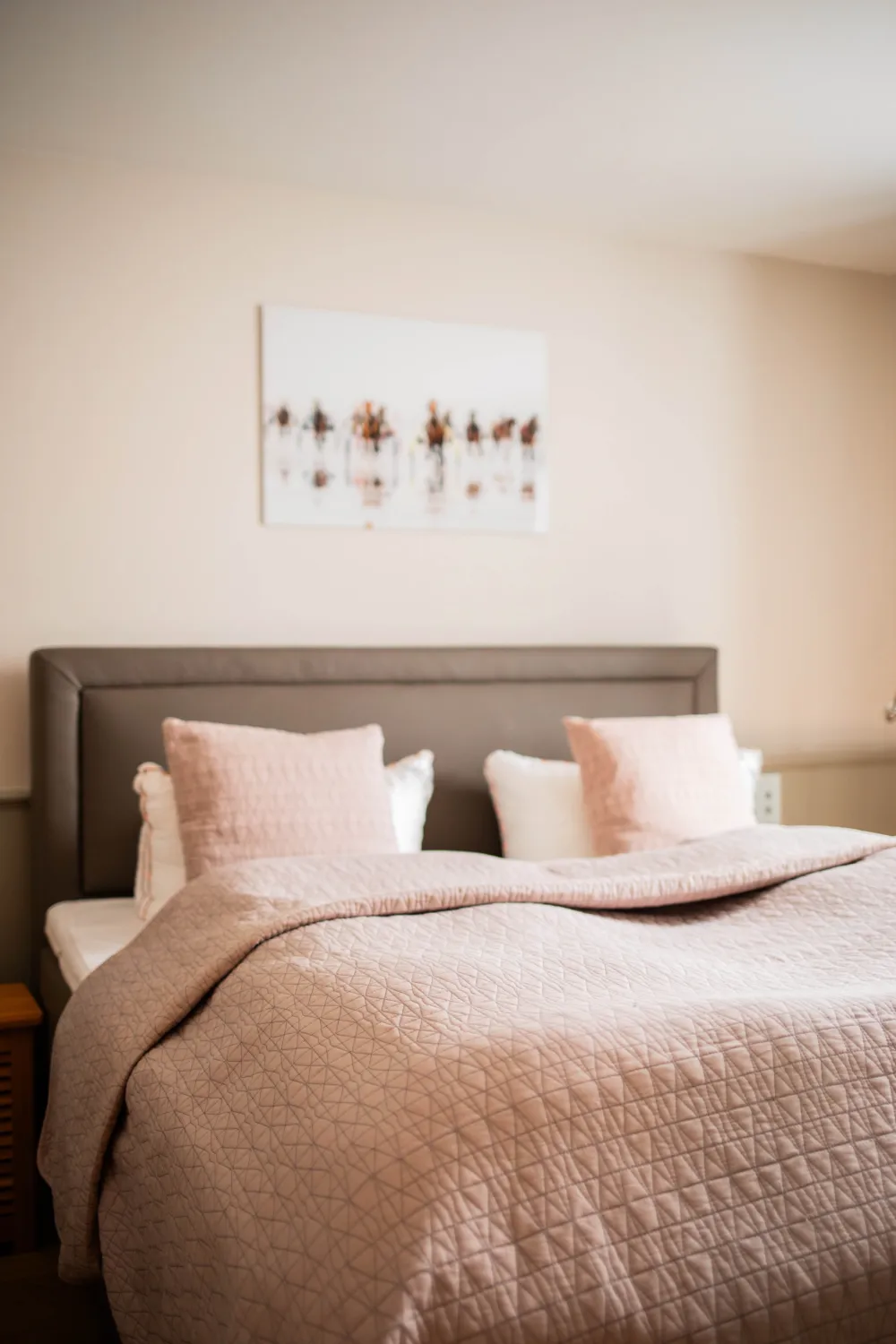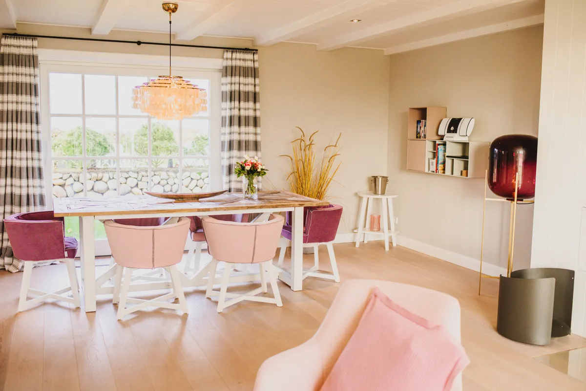 Natürlich lasse ich es mir nicht nehmen und schaue mir auch die andere Hälfte des Doppelhauses, Üp Klef 6c an. Wenngleich sich die beiden Ferienunterkünfte unter einem Reetdach befinden, könnte ihr Interieur nicht unterschiedlicher sein. Im Gegensatz zu den maritimen Akzenten und vielen Blautönen seines Nachbarns, finde ich mich hier in einem rosaroten Traum wieder. Gemeinsamkeiten erkenne ich trotzdem: Ein offenes, helles Raumdesign, top moderne Ausstattung und natürlich den Blick aufs Watt.