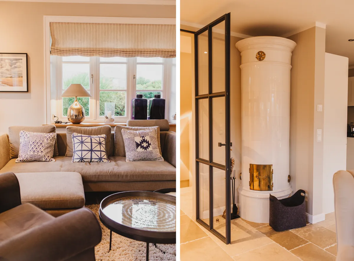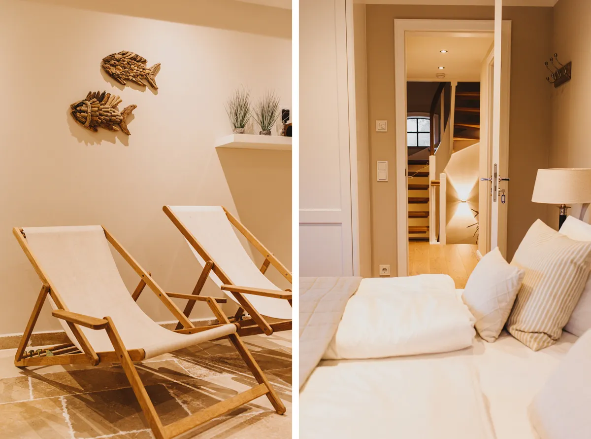 Dass erdige Naturtöne, grauer Steinboden und viel Weiß so gemütlich sein können, überrascht mich total. Die Einrichtung ist schlicht, aber elegant. Detailreich, aber nicht überladen. Einfach genau mein Geschmack! Mein Highlight in dem offenen Wohn- und Esszimmer mit Küchennische ist definitiv der Kachelofen, der dem Reetdachhaus an Schietwettertagen Wärme schenkt. Im Untergeschoss befindet zudem nicht nur ein Doppelzimmer, sondern gleich eine ganze Wellness-Oase mit Ruheliegen und Sauna.