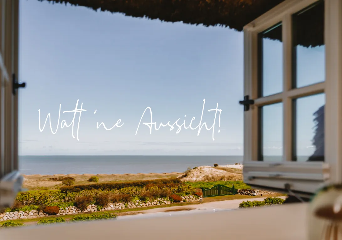 Direkt am Morsumer Watt besuche ich als nächstes das Ferienhaus Üp Klef 6d. Auch hierbei handelt es sich um eine 5-Sterne-Ferienunterkunft: eine Doppelhaushälfte unter Reet mit syltigen Sprossenfenstern und freiem Blick auf die Nordsee. Grandiose Sonnenaufgänge über dem Wattenmeer sind hier somit inklusive!