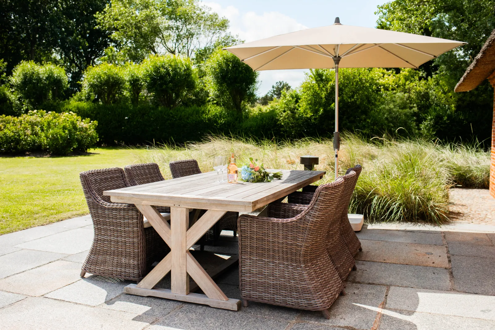 Das exklusive 5-Sterne-Reetdachhaus erstreckt sich auf beachtlichen 310 m2. Damit bietet es ausreichend Platz für bis zu sechs Personen. Familien mit Kindern, befreundete Pärchen und mittelgroße Reisegruppen sind hier also genau richtig. Oder wer gerne draußen ist und viel Zeit in der Natur verbringt. Die Ausrichtung des Hauses ist perfekt für Sonnenanbeter*innen, denn vom Aufwachen im Master-Bedroom bis zum Sundowner auf der West-Terrasse wirst du hier von der Sonne begleitet.