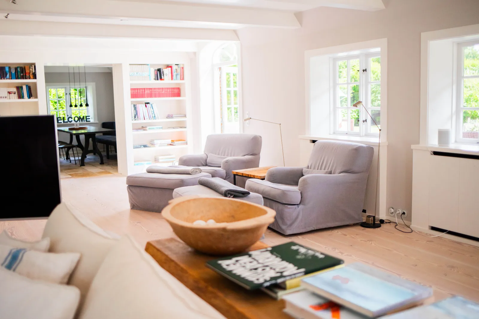In dem Ferienhaus genießt du eine komplette Ausstattung, die nichts vermissen lässt: von der Loewe Unterhaltungselektronik über Küchengeräte aller Art bis hin zur Sonos Sound-Anlage. Eine traumhafte Küche, großzügig geschnittene, offene Räume und gleich zwei Terrassen mit hochwertigen Möbeln – ich bin sprachlos! An frischeren Tagen lässt es sich am Kamin im Wohnzimmer oder in einem der Topmodelle der Klaffs Saunen wunderbar entspannen. Alles in allem ein Anwesen, das nur auf ein Ziel hin konzipiert ist: Wohlfühlen.