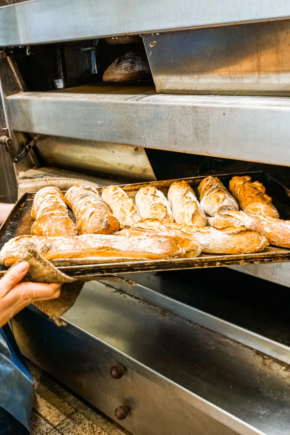 Ich freue mich riesig, als Jens mich mit hinter die Theke in die Backstube führt. Hier werkeln gleich mehrere Bäcker und Bäckerinnen an frischen Broten, feinen Keksen und kunstvollen Torten. In der einen Ecke werden Stollen geknetet, in der anderen Dinkelbaguettes geformt. Eine Backstube weiter wird das erste Weihnachtsgebäck ausgestochen. Ich bin fasziniert: Meine Augen wissen gar nicht, wo sie zuerst hinschauen sollen und meine Nase ist sich nicht sicher, welchem wohlig warmen Duft sie folgen möchte.