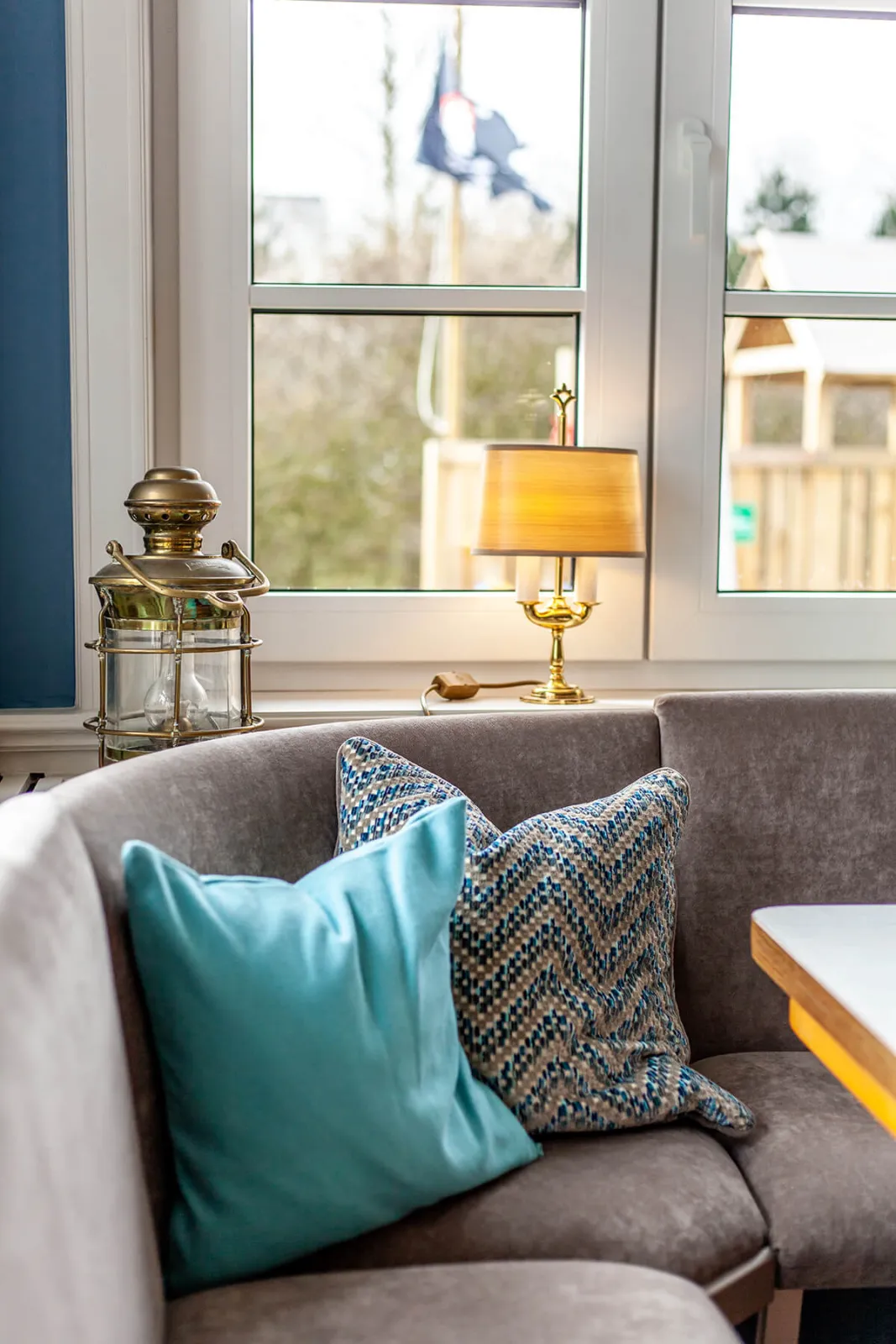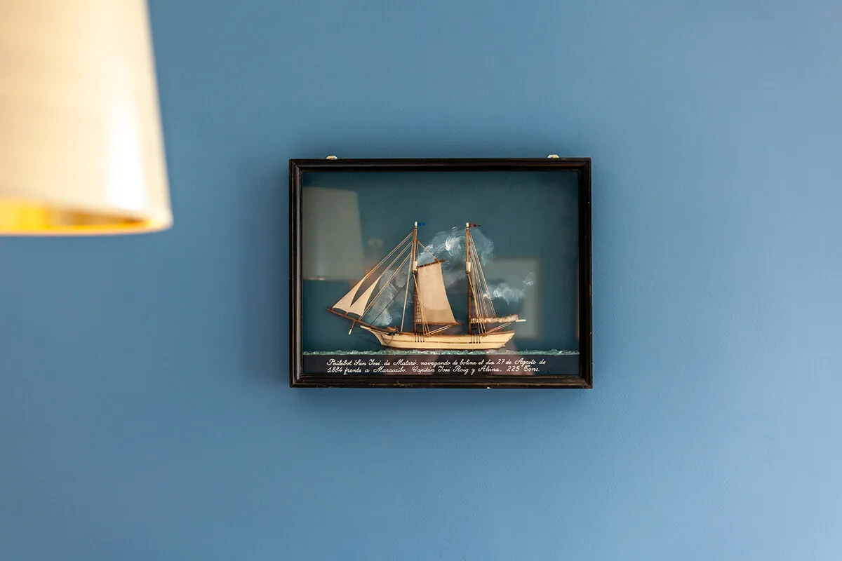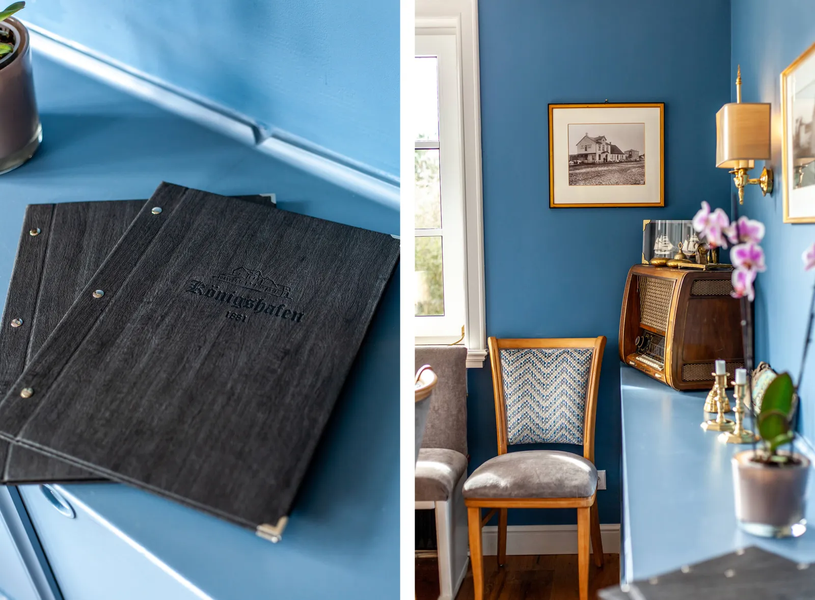 Im Jahr 1881 wurde das Haus, vor dem sich ein großer Parkplatz befindet, erbaut. Ein Ort mit viel Geschichte. Das wird auch anhand der Einrichtung deutlich: maritime Elemente, gemischt mit alten Fotografien und Porträts der Hansens. Die Räumlichkeiten teilen sich in vier gemütliche Gaststuben auf, die mit viel Liebe zum Detail gestaltet wurden. Die Sitzecke mit den blau-weißen Fliesen gefällt mir besonders gut.