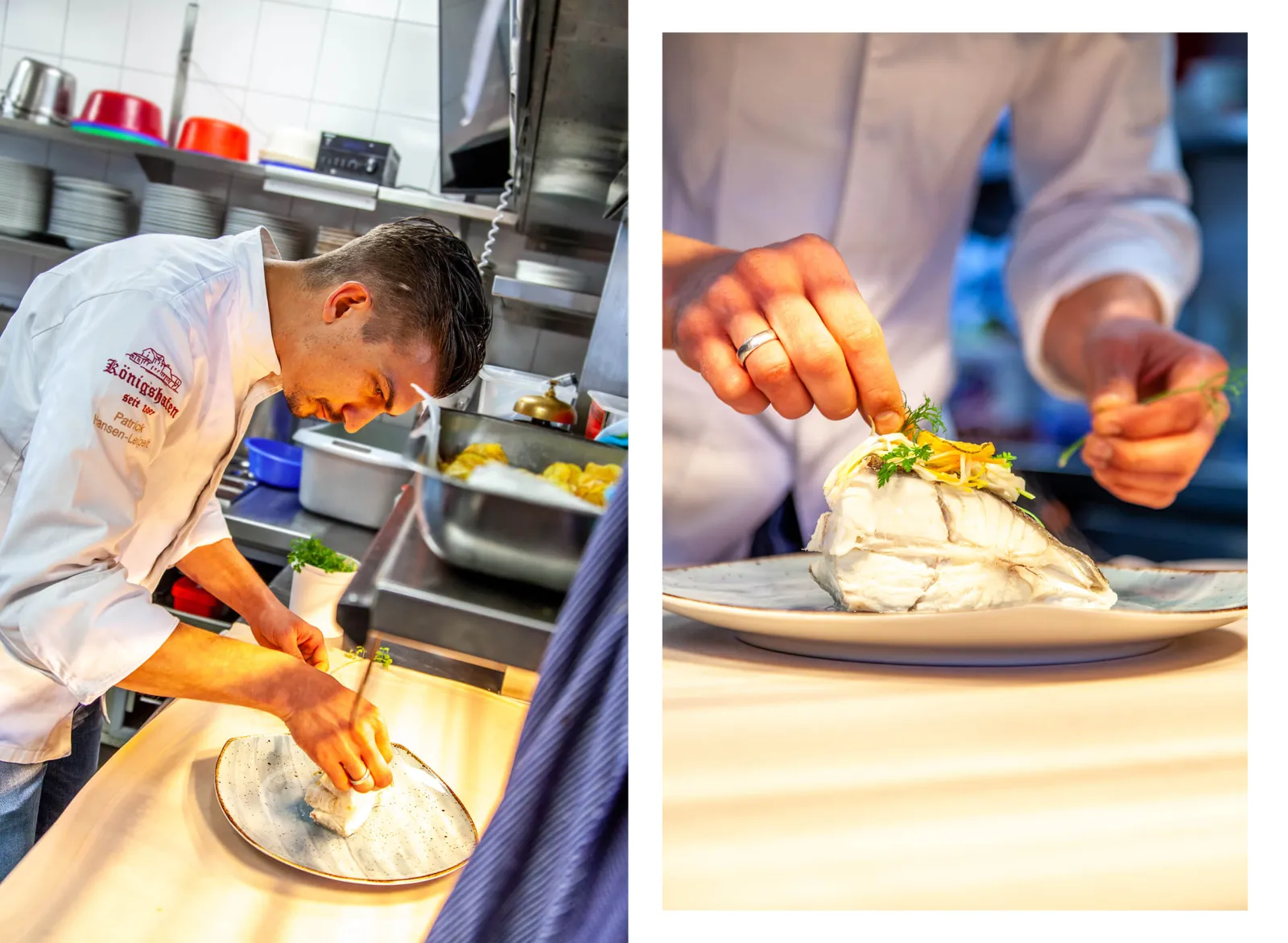 Während ich mich in Ruhe umsehe, wirbelt der zweifache Familienvater Patrick zusammen mit seiner Küchen-Crew hinter dem Herd herum. Der leidenschaftliche Koch vereint hier altbewährte Köstlichkeiten mit einer frischen Brise aus der modernen Küche – und das auf höchstem Niveau. Dabei profitiert er sicherlich von seiner langjährigen Erfahrung in der Sterneküche.