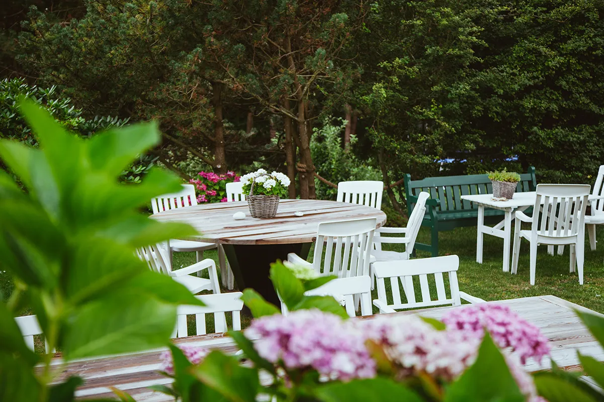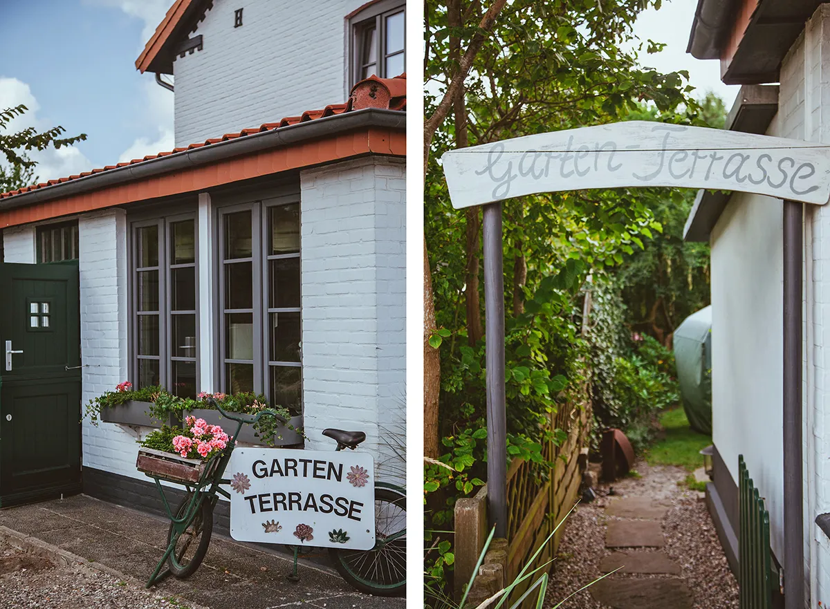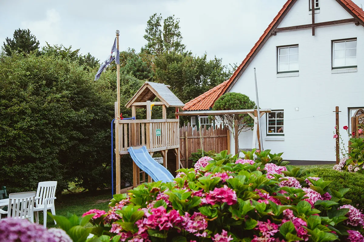 Hinter dem Haus verbirgt sich ein wunderschöner Garten mit einer großen Terrasse. Hier fallen mir die robusten Tische ins Auge, die vom Strandgut-Banditen Bo in seiner Werkstatt Dünenstrauss gefertigt wurden. Eine große Tafel bietet Platz für bis zu 12 Personen. Perfekt für Freunde oder Familien. Kinder freuen sich auf jeden Fall über den niedlichen Spielplatz. Ich finde es toll, dass die Hansens sich so viel Gedanken um ihre kleinen Gäste gemacht haben.